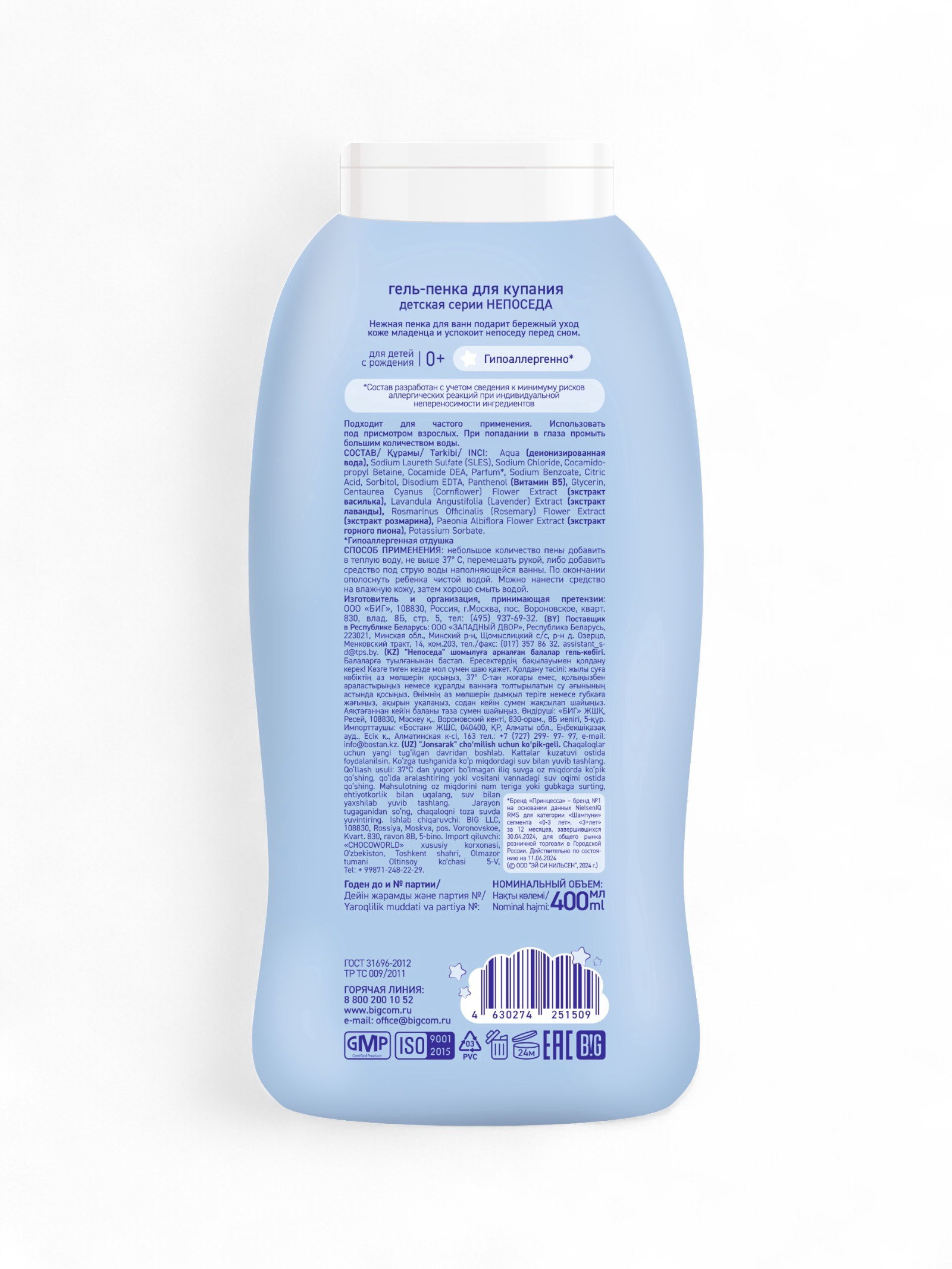 Размер упаковки: 8.5 x 4 x 19 см. tnved: 3401300000 Аромат: Нейтральный Возраст: От 0 месяцев Температурное ограничение: Нет Гель-пенка с горным пионом Непоседа создан специально для ухода за нежной кожей новорожденных. Не сожержит SLS, парабены, метилы, красители и аллергены. Нежный гель подходит как для бережного очищения кожи, так и для создания мягкой пены для принятия вечерней ванны. Благодаря Д-пантенолу и комплексу натуральных экстрактов пиона и розмарина, гель-пенка не только бережно очищает нежную кожу, но так же обеспечивает увлажнение и питание, способствует снятию ощущения сухости и раздражений. А нежный гипоаллергенный аромат успокоит кроху перед сном. Состав разработан с учетом сведения к минимуму рисков аллергических реакций при индивидуальной непереносимости ингредиентов. Способ применения: нанести на губку или ладонь, вспенить и равномерно распределить, затем тщательно смыть водой. Можно использовать в качестве пены для ванны. Подходит для ежедневного применения. Аромат: нейтральный аромат детской косметики. Состав: Aqua (деионизированная вода), Sodium Laureth Sulfate (SLES), Sodium Chloride, Cocamidopropyl Betaine, Cocamide DEA, Parfum, Sodium Benzoate, Citric Acid, Sorbitol, Disodium EDTA, Panthenol (Витамин В5), Glycerin, Centaurea Cyanus (Cornflower) Flower Extract (экстракт василька), Lavandula Angustifolia (Lavender) Extract (экстракт лаванды), Rosmarinus Officinalis (Rosemary) Flower Extract (экстракт розмарина), Paeonia Albiflora Flower Extract (экстракт горного пиона), Potassium Sorbate. Условия хранения: Условия хранения: Хранить в сухом прохладном месте при температуре от 0 до +25 градусов. Цельсия и относительной влажности воздуха не более 70%. | ||