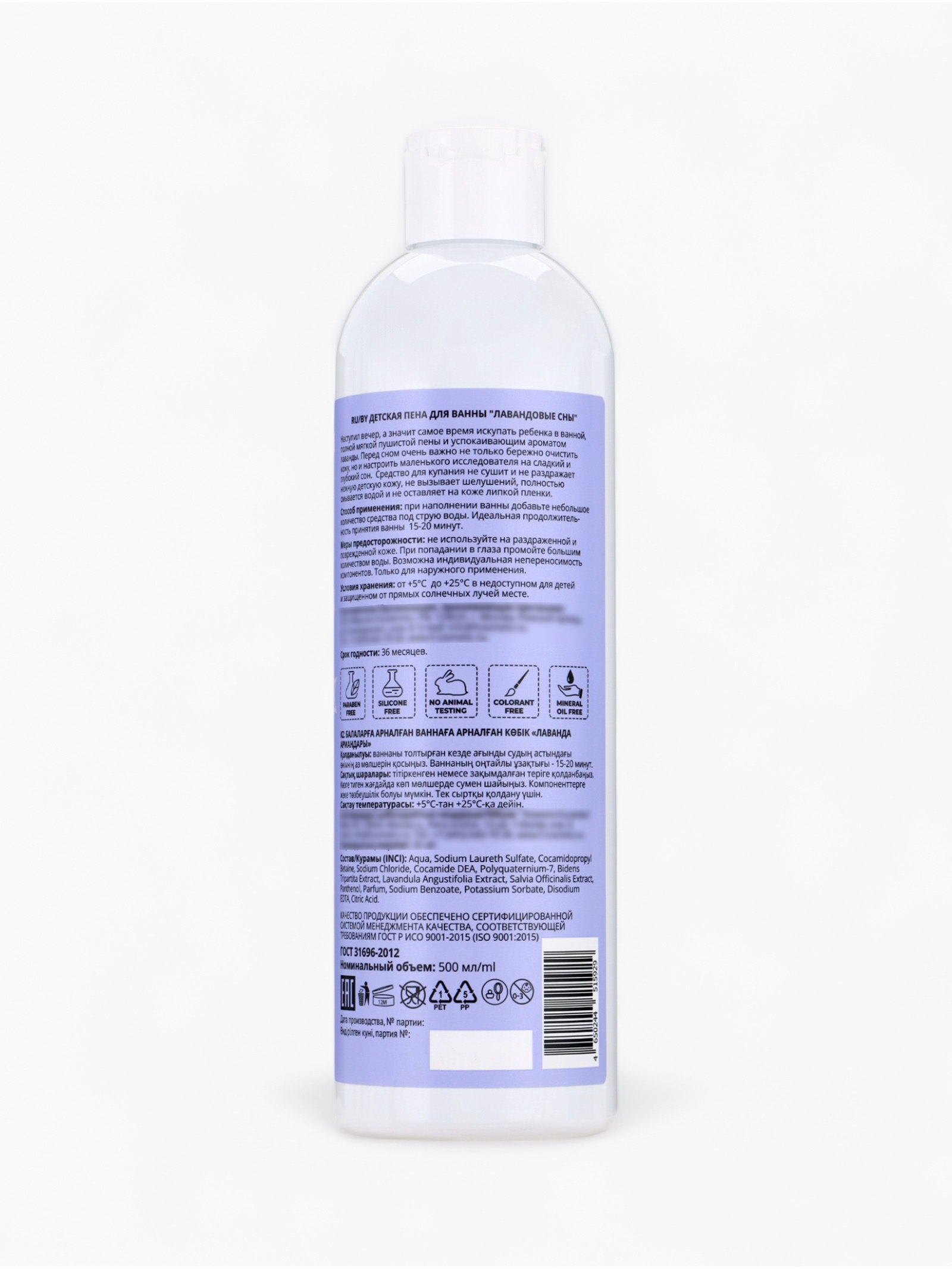 Состав (INCI): Aqua, Sodium Laureth Sulfate, Cocamidopropyl Betaine, Sodium Chloride, Cocamide DEA, Polyquaternium-7, Bidens Tripartita Extract, Lavandula Angustifolia Extract, Salvia Officinalis Extract, Panthenol, Parfum, Sodium Benzoate, Potassium Sorbate, Disodium EDTA, Citric Acid. Способ применения: При наполнении ванны добавить небольшое количество средства под струю воды. Рекомендуемая продолжительность купания 15–20 минут. Меры предосторожности: Не использовать на раздраженной или поврежденной коже. При попадании в глаза промыть большим количеством воды. Возможна индивидуальная непереносимость компонентов. Только для наружного применения. | ||