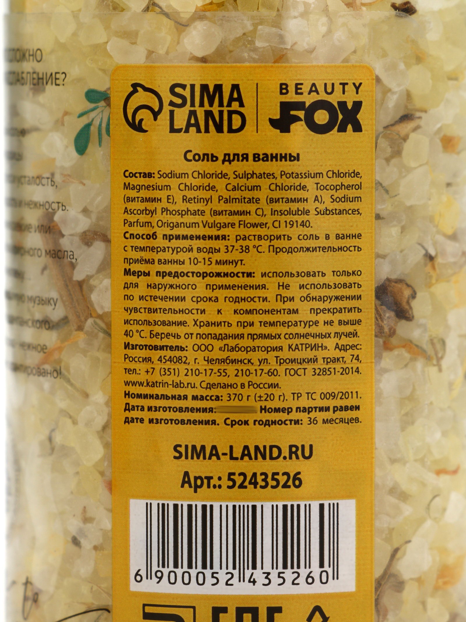 Область применения: Для тела, Для тела Вид: Соль, Соль для ванны Размер упаковки: 6.3 x 13 x 6.3 см. Темпер. ограничение НЕ ВЫШЕ ℃: +25 Тематика подарка: Уходовая косметика Назначение: Очищение, детокс Возраст: Для взрослых Для кого: Для женщины Вид упаковки: Без упаковки Темпер. ограничение НЕ НИЖЕ ℃: +5 Цвет: Бежевый Адресат: Без адресата Тематика праздника: Универсальная тематика Тематика праздника: Универсальная тематика tnved: 3307300000 Вес, г: 370 Набор: Нет Аромат: Душица Состав: Sodium Chloride, Sulphates, Potassium Chloride, Magnesium Chloride, Calcium Chloride, Tocopherol (витамин Е), Retinyl Palmitate (витамин А), Sodium Ascorbyl Phosphate (Витамин С), Insoluble Substances, Parfum, Origanum Vulgarе Flower, Сl 19140. | ||