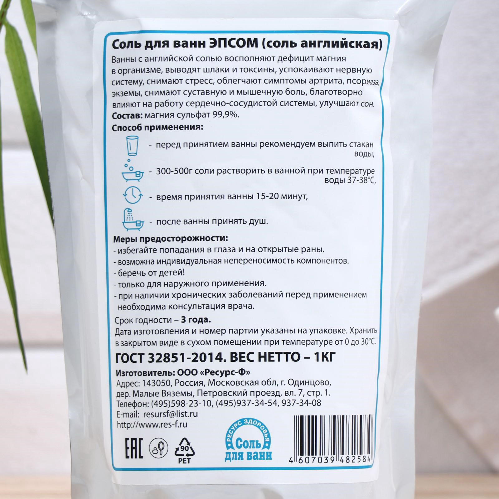 Соль для ванн EPSOM "Английская магниевая", 1 кг, Ресурс-Ф, Россия