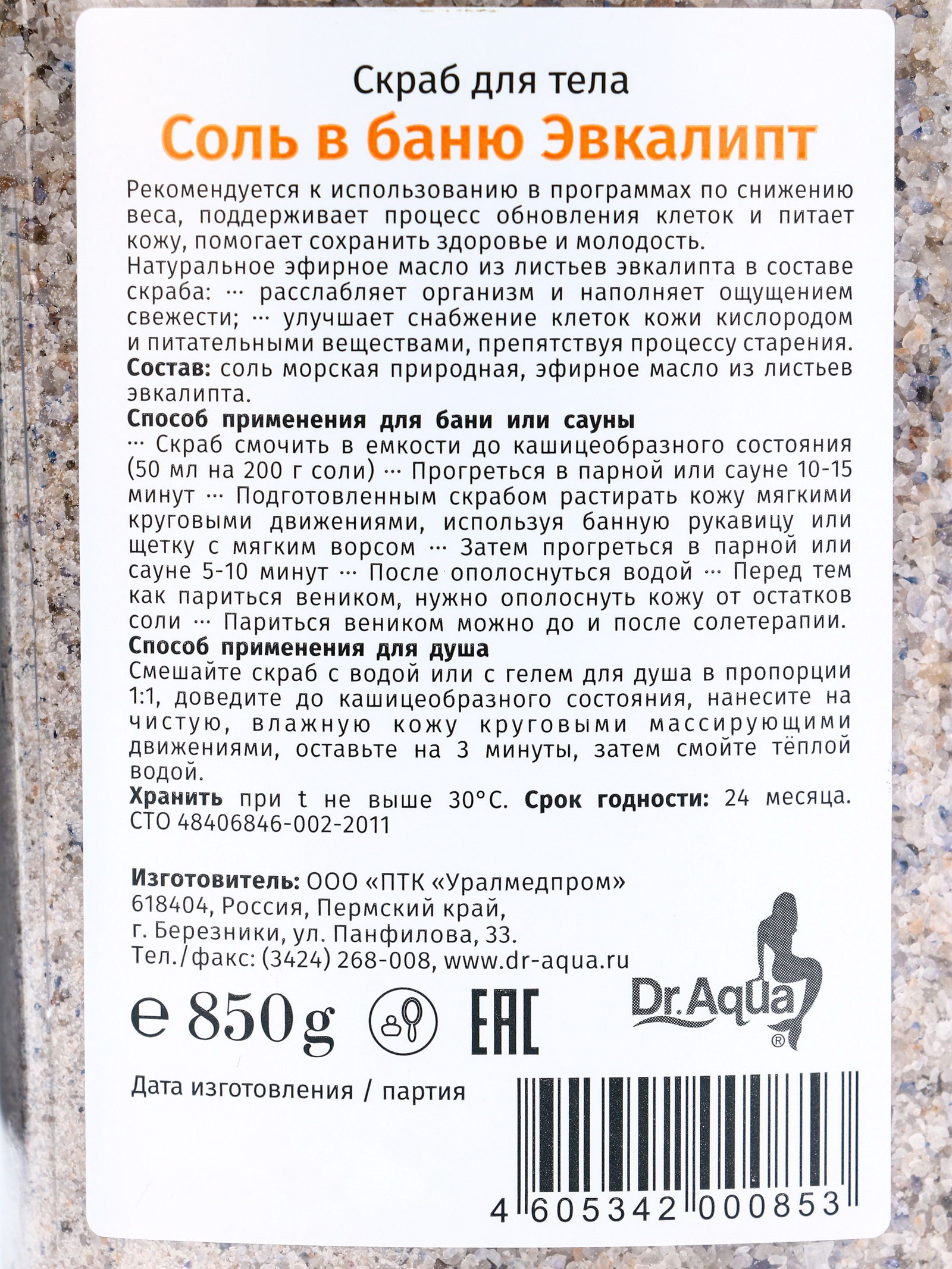 Соль-скраб для бани, с эвкалиптом, 850 г, Dr. Aqua, Россия