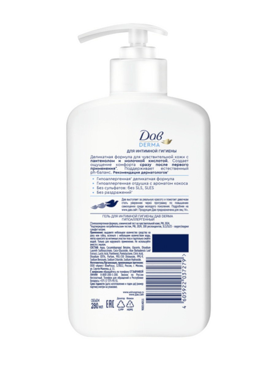 Размер упаковки: 7.5 x 3 x 15 см. tnved: 3401300000 Температурное ограничение: Нет Вид: Гель Для кого: Для неё Гель для интимной гигиены Дав Derma – это средство ухода, созданное специально для женщин и девушек. Гипоаллергенная деликатная формула для чувствительной кожи с пантенолом и молочной кислотой поддерживает естественный pH - баланс интимной зоны. Благодаря отсутствию сульфатов (SLS, SLES), жидкое средство для подмывания с адаптированным pH сохраняет естественную защиту кожи. Легкая гипоаллергенная отдушка с запахом кокоса дарит ощущение свежести после каждого применения. Создает ощущение комфорта сразу после первого применения. Способ применения: выдавите небольшое количество средства на руку или губку, вспеньте с небольшим количеством воды, мягко нанесите на интимные участки тела и тщательно смойте водой. Только для наружного применения. Не используйте вместе с мылом. Состав: Aqua, Cocamidopropyl Betaine, Glycerin, Disodium Laureth Sulfosuccinate, Coco-Glucoside, Aloe Barbadensis Leaf Extract, Panthenol, Pantolactone, Citric Acid, Disodium EDTA, Lactic Acid, Parfum, PEG-150 Distearate, PPG-9, Sodium Benzoate, Sodium Chloride, Sodium Hydroxide. | ||