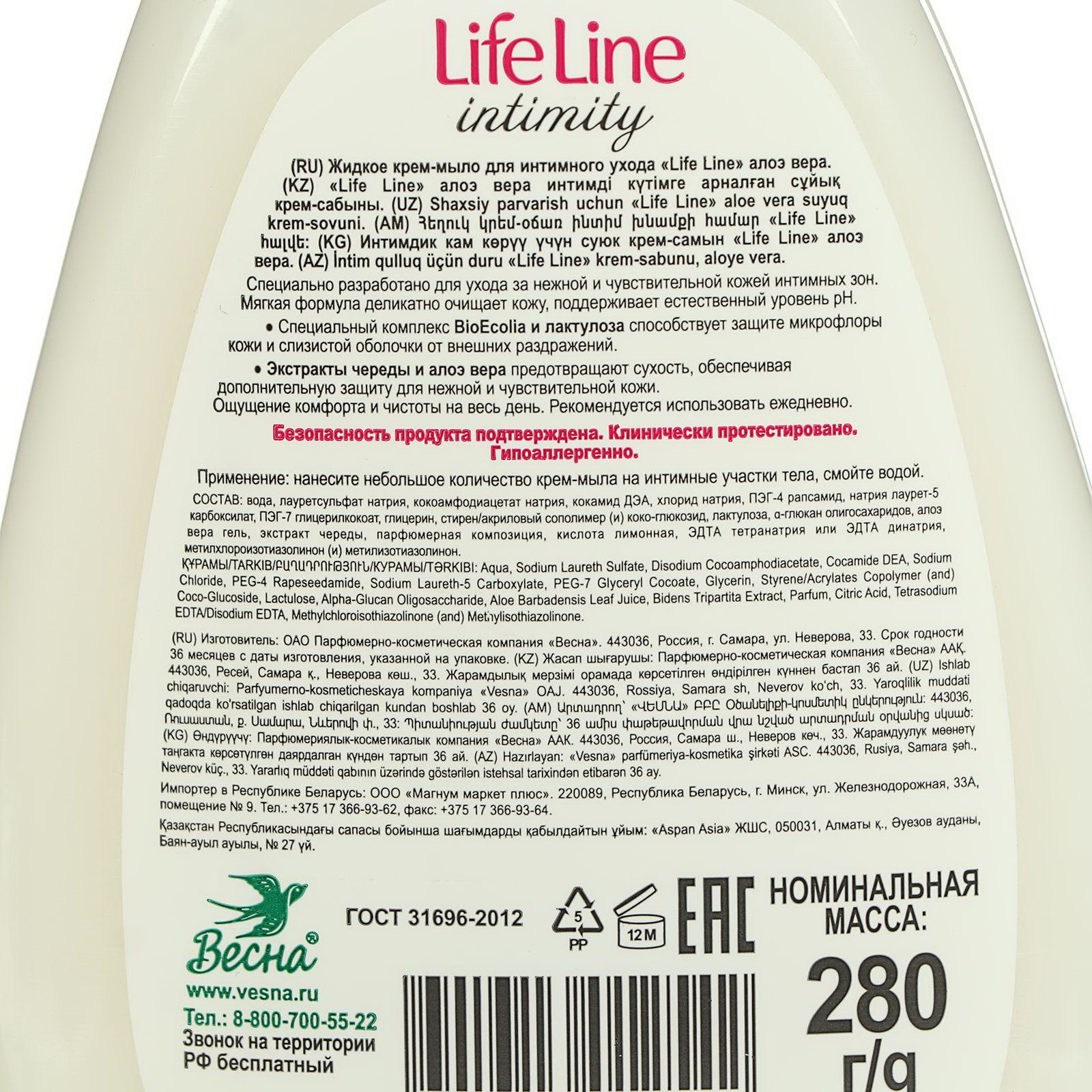 Крем-мыло для интимного ухода "Алоэ вера", 280 г, 4.4x8.4x16.3 см., LIFE LINE, Россия