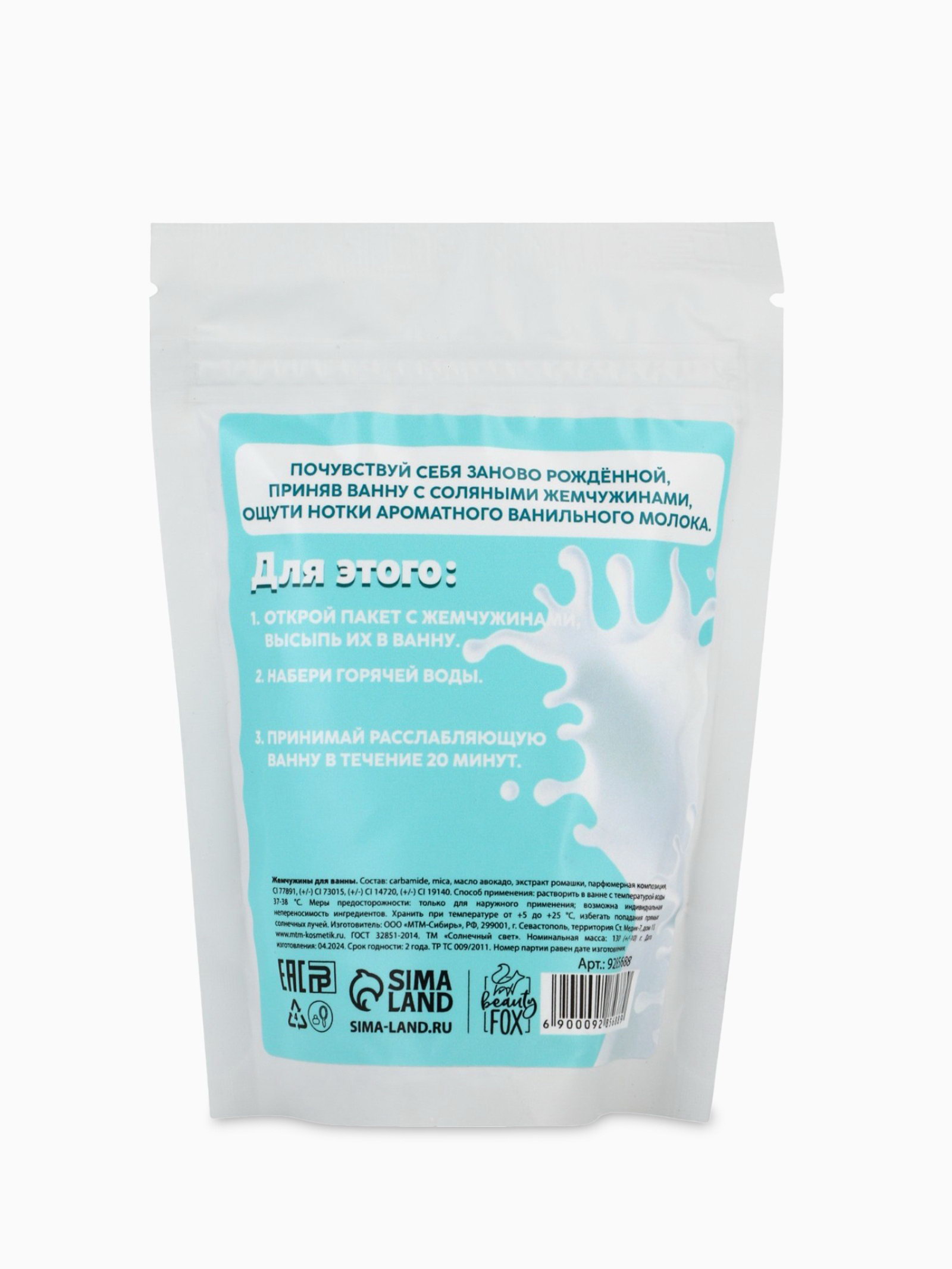 Жемчуг для ванны соляной "Ваниль с молоком", 130 г, 130 мл., Beauty Fox, Россия