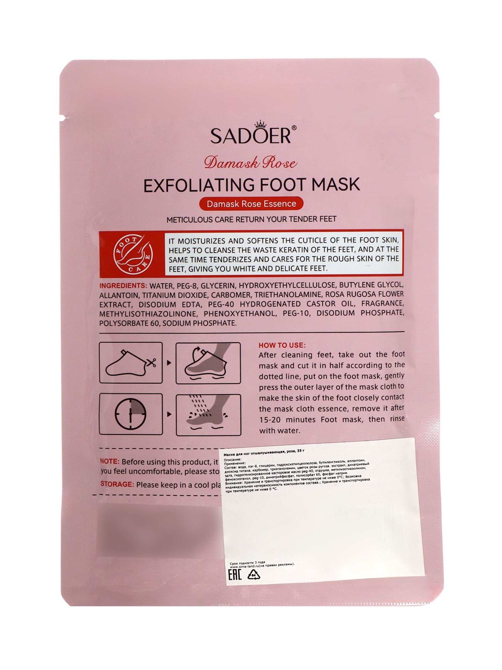 Отшелушивающая маска-носки для ног роза, 35 г, 5x10x5 см., SADOER, Китай
