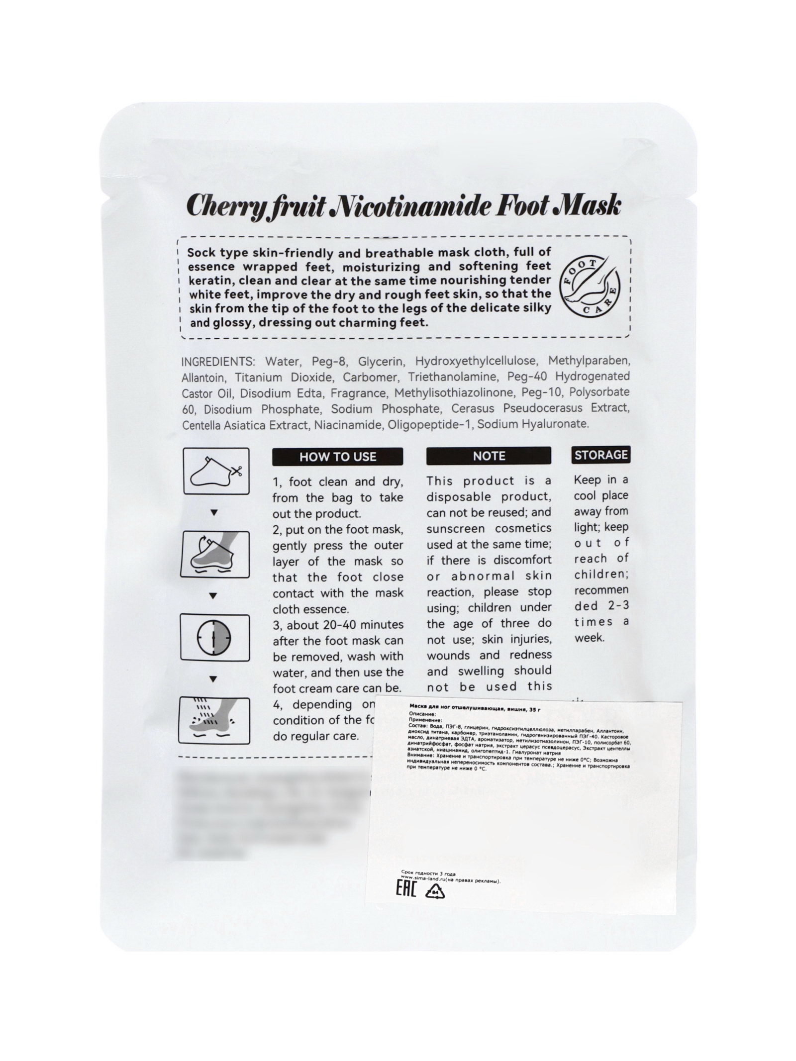 Размер упаковки: 12 x 0.5 x 18 см. tnved: 3304990000 Назначение: Пилинг, отшелушивание Вид: Маска Sadoer отшелушивающая маска-носки для ног с вишней это эффективное средство для домашнего ухода за кожей стоп, которое мягко удаляет омертвевшие клетки, смягчает и увлажняет кожу, оставляя её гладкой, мягкой и ухоженной. Особенности продукта