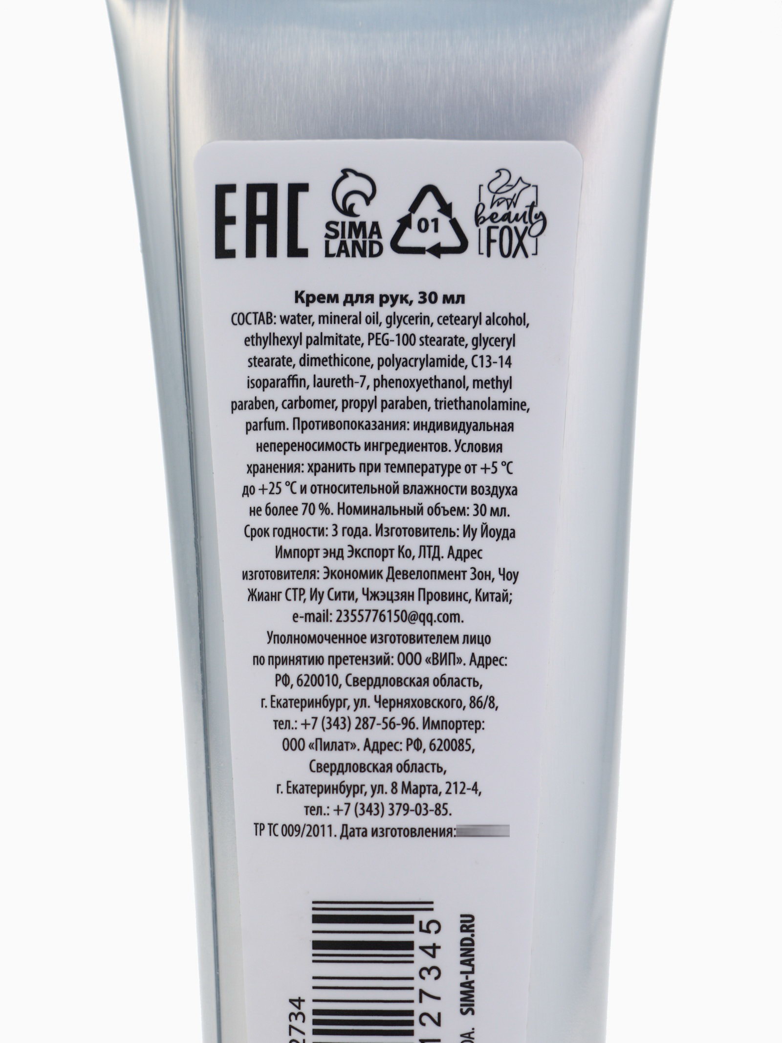 Область применения: Для рук, Для тела Вид: Крем, Крем для рук Размер упаковки: 4 x 10.5 x 2.5 см. Темпер. ограничение НЕ ВЫШЕ ℃: +25 Набор: Нет Вид упаковки: Тюбик Возраст: Для взрослых Для кого: Для женщины Аромат: Цитрус Назначение: Увлажнение Тематика подарка: Уходовая косметика Темпер. ограничение НЕ НИЖЕ ℃: +5 Вес, г/Объём, мл: 30 Тематика праздника: Универсальная тематика Адресат: Без адресата Адресат: Без адресата tnved: 3304990000 СОСТАВ: water, mineral oil, glycerin, cetearyl alcohol, ethylhexyl palmitate, PEG-100 stearate, glyceryl stearate, dimethicone, polyacrylamide, C13-14 isoparaffin, laureth-7, phenoxyethanol, methyl paraben, carbomer, propyl paraben, triethanolamine, parfum, CI15985. | ||