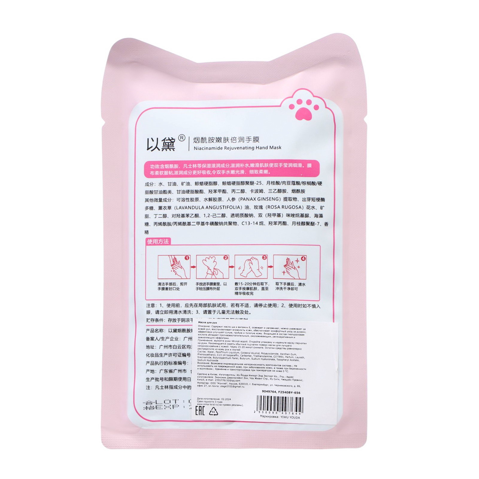 Размер упаковки: 12 x 0.3 x 18.5 см. tnved: 3304990000 tnved: 3304990000 Вид: Маска Вид: Маска Содержит масло ши и витамин Е, освежает и увлажняет, нежно ухаживает за кожей рук, восстанавливает влажность кожи, обеспечивает комфортный уход за руками, эффективно улучшает сухую, грубую и тусклую кожу. Входящая в состав гиалуроновая кислота обладает противовоспалительным, омолаживающим, регенеративным и заживляющим эффектами. Способ применения: вымойте руки тёплой водой. Откройте упаковку и наденьте маску-перчатки на руки. Рекомендуется надеть обычные перчатки поверх маски для лучшего соприкосновения с кожей. Через 15-20 минут снимите. Остатки средства равномерно распределите на кожу рук и локтей. Состав: вода, минеральное масло, витамин В3, масло ши, гиалуронат натрия, витамин Е, масло виноградной косточки, цетеариловый спирт, полиакриламид, ксантановая камедь, феноксиэтанол, С13-14 изопарафин, гидроксид натрия, карбомер, триэтаноламин, диоксид титана, ароматизатор, лаурет. | ||