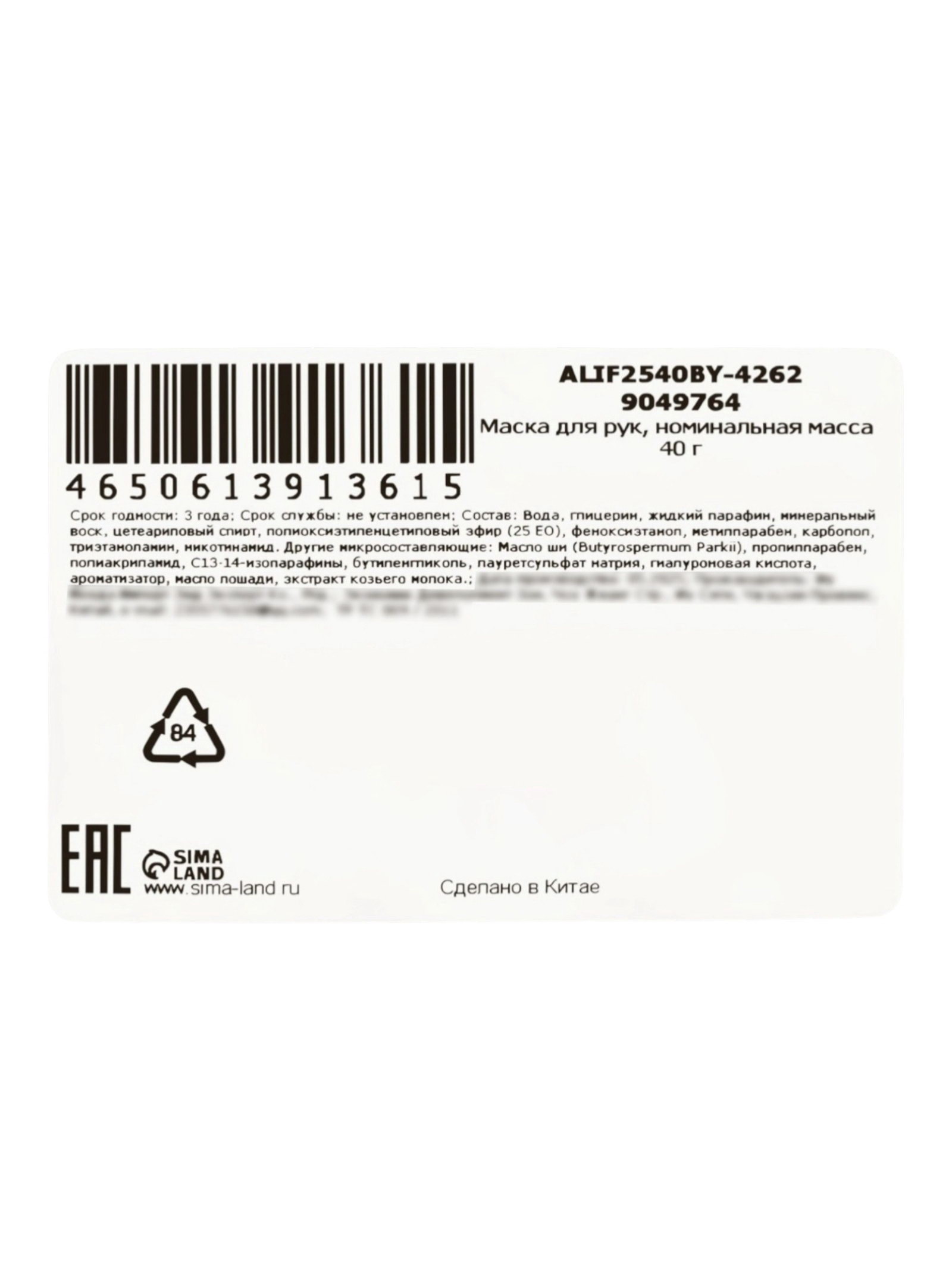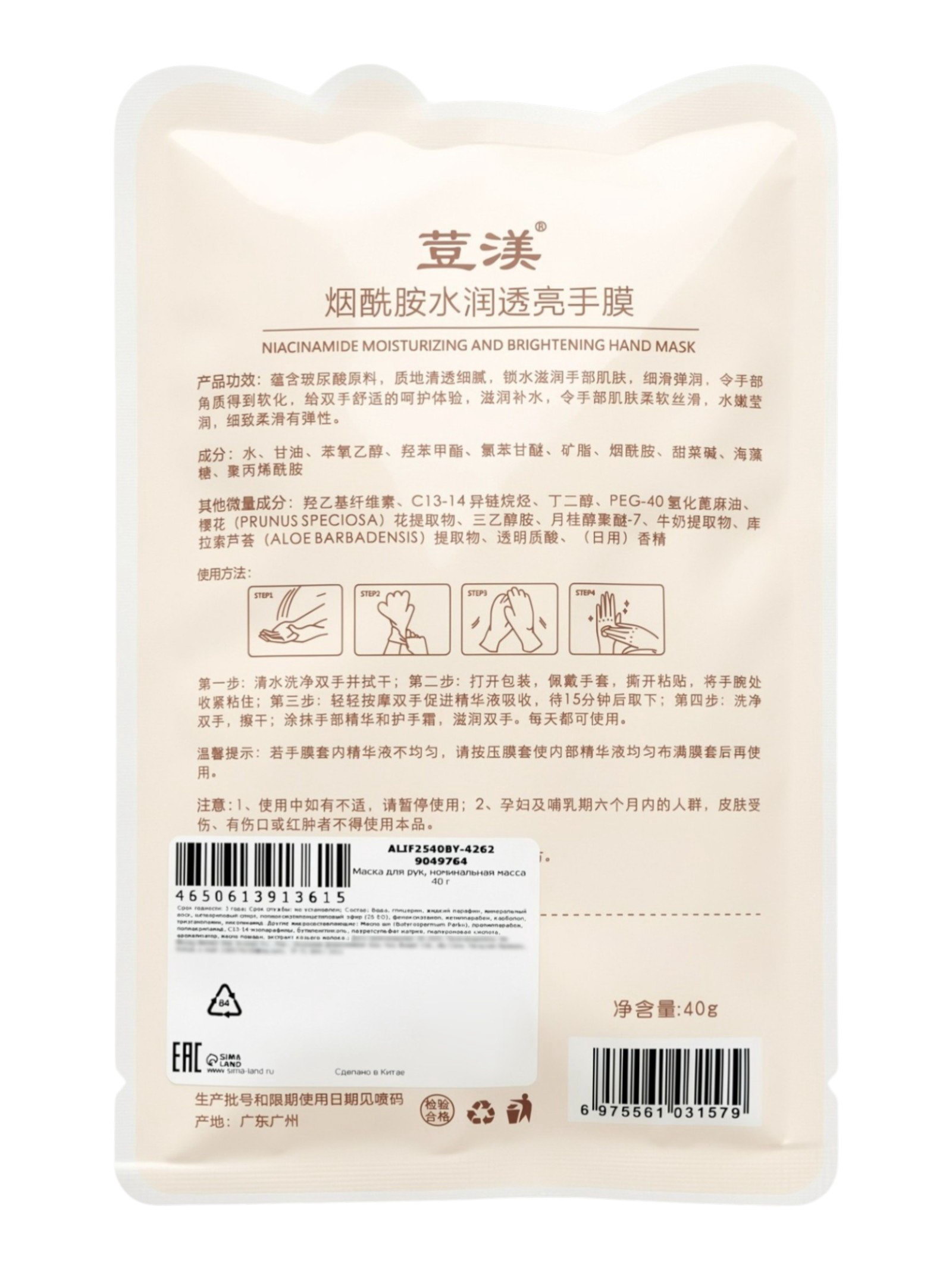 Размер упаковки: 12 x 0.3 x 18.5 см. tnved: 3304990000 Вид: Маска Вид: Маска Содержит масло ши и витамин Е, освежает и увлажняет, нежно ухаживает за кожей рук, восстанавливает влажность кожи, обеспечивает комфортный уход за руками, эффективно улучшает сухую, грубую и тусклую кожу. Входящая в состав гиалуроновая кислота обладает противовоспалительным, омолаживающим, регенеративным и заживляющим эффектами. Способ применения: вымойте руки тёплой водой. Откройте упаковку и наденьте маску-перчатки на руки. Рекомендуется надеть обычные перчатки поверх маски для лучшего соприкосновения с кожей. Через 15-20 минут снимите. Остатки средства равномерно распределите на кожу рук и локтей. Состав: вода, минеральное масло, витамин В3, масло ши, гиалуронат натрия, витамин Е, масло виноградной косточки, цетеариловый спирт, полиакриламид, ксантановая камедь, феноксиэтанол, С13-14 изопарафин, гидроксид натрия, карбомер, триэтаноламин, диоксид титана, ароматизатор, лаурет. | ||