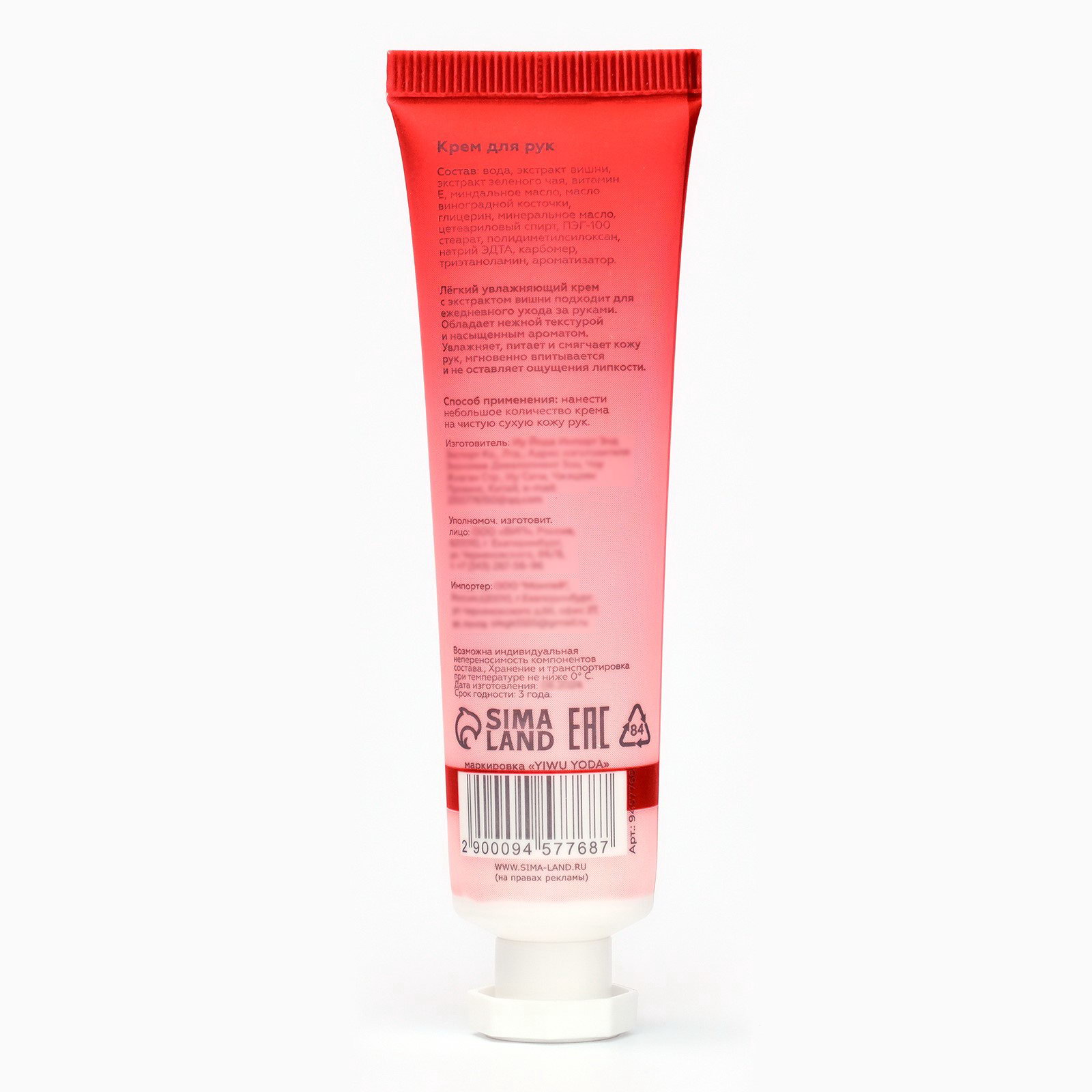 Крем для рук "Вишня" увлажняющий, 30 мл МИКС, 3x4x11 см., Китай