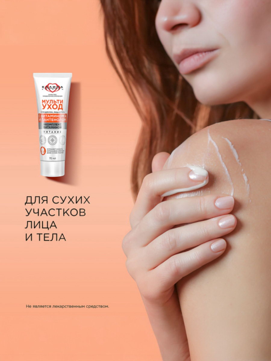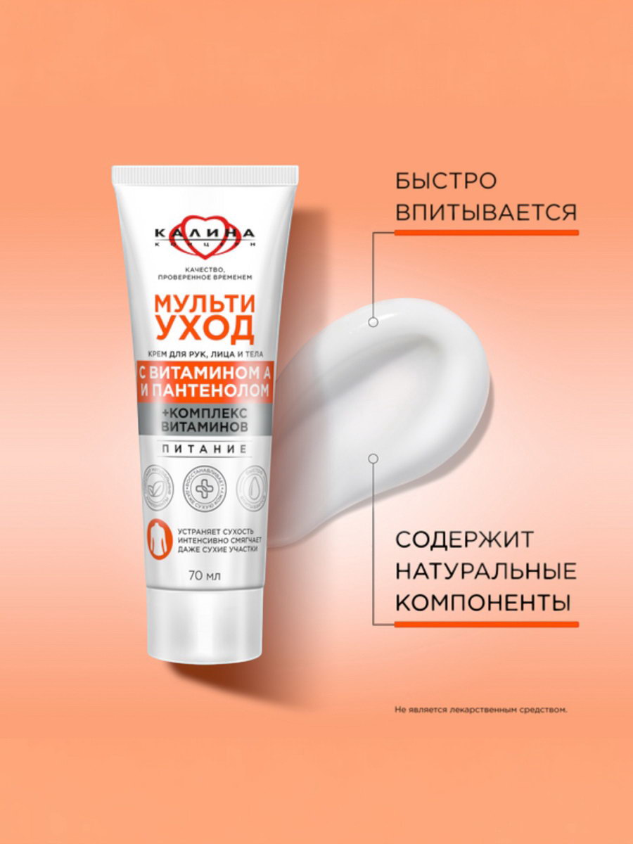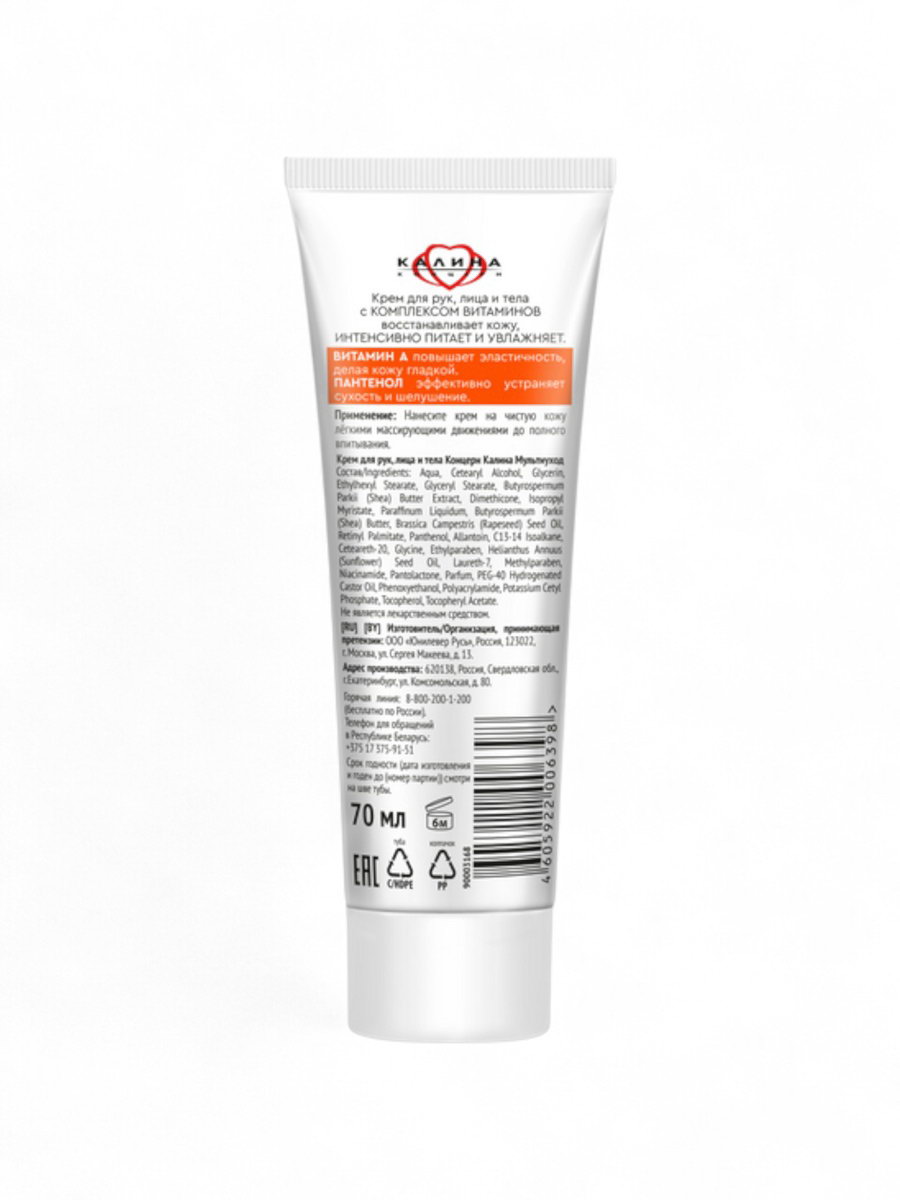 Крем для рук, лица и тела "КАЛИНА", мультиуход, с витамином А и пантенолом, 70 мл, Концерн Калина, Россия