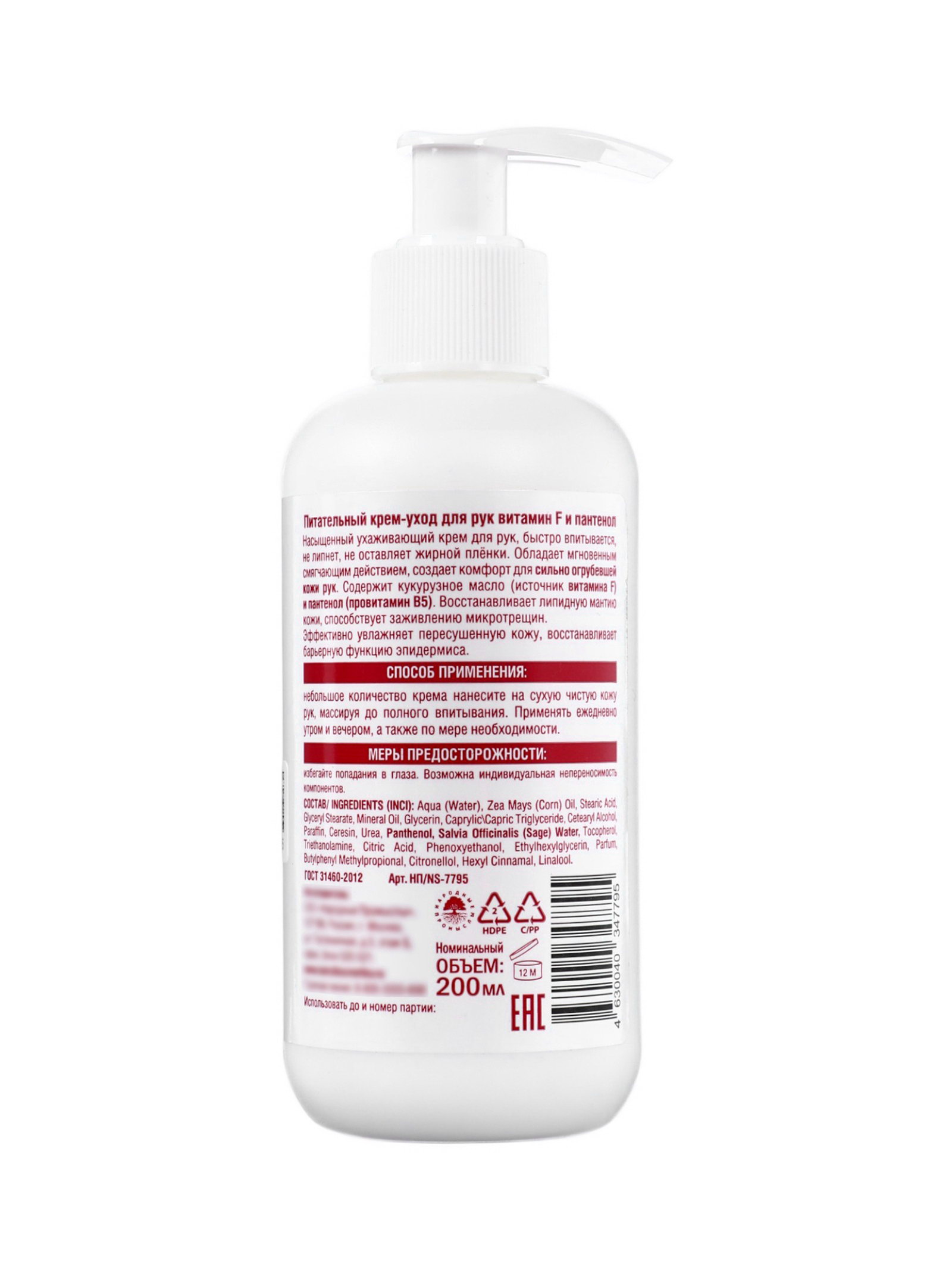 Крем-уход для рук питательный витамин F и пантенол, 200 мл, NOVOSVIT, Россия
