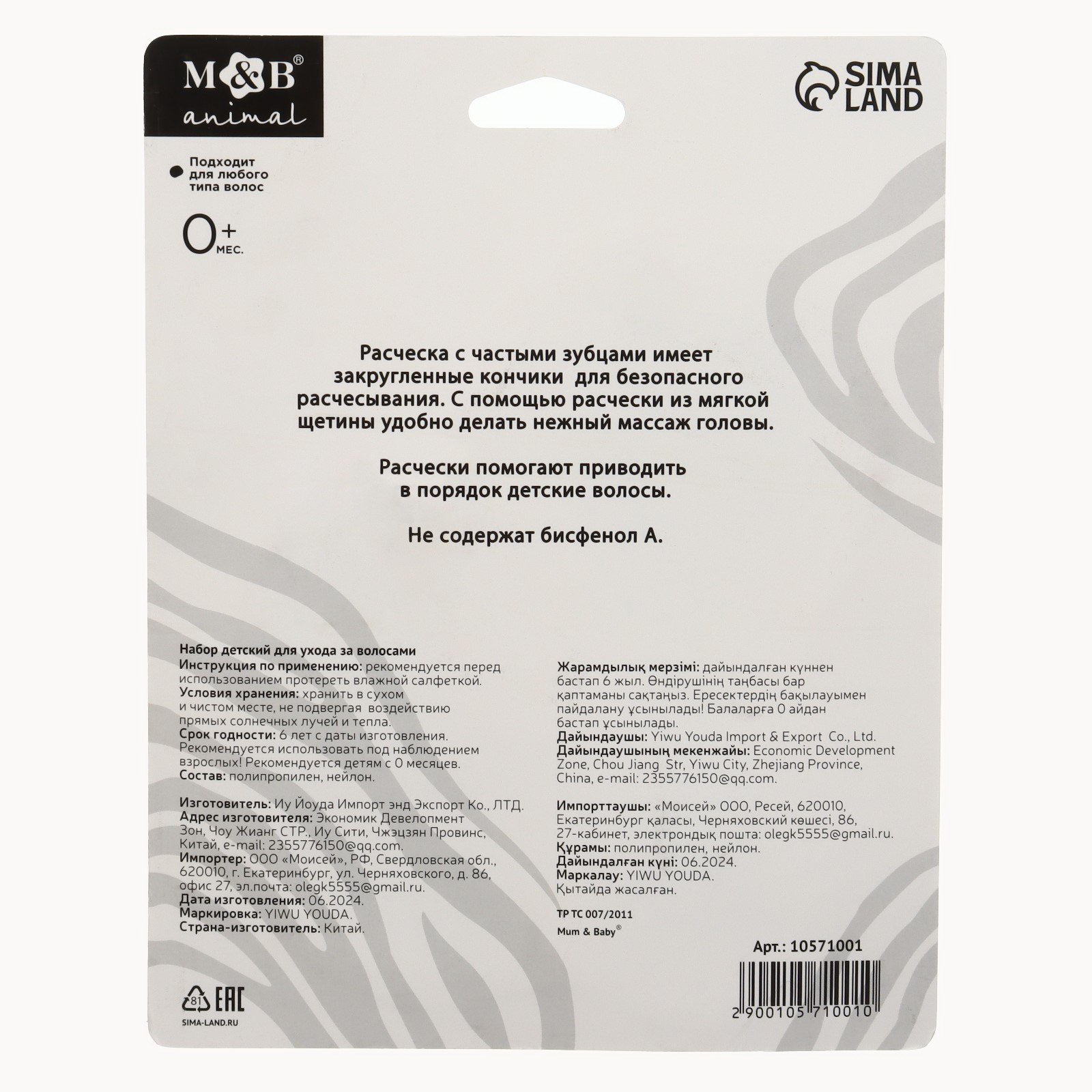 Тип расчёски: Простая, С ручкой Размер упаковки: 16 x 3 x 20.5 см. Цвет: Белый Составляющие набора: Расчёска для волос Для новорождённых: Да В наборе, шт.: 2 Набор: Да Рисунок: Да Эксклюзивный дизайн: Да Для кого: Унисекс Русская упаковка: Да Для малышей: Да Возраст: Для детей tnved: 9615110000 Набор для ухода за волосами "Зебра" состоит из щётки и расчёски. Он предназначен для детей и обеспечивает бережный уход за волосами. | ||