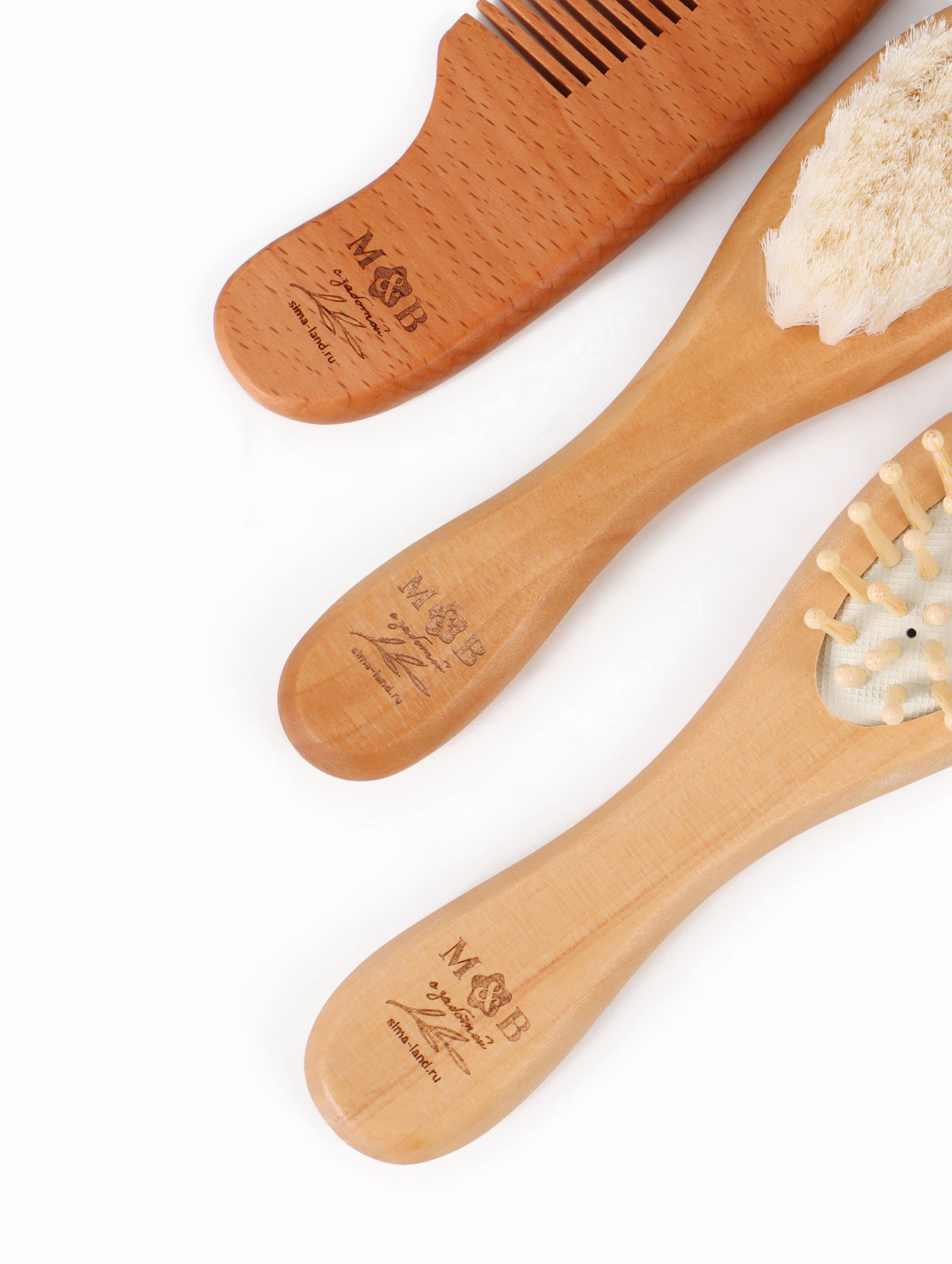 Расческа детская, деревянная с натуральной щетиной, гребень, массажная, набор 3 шт., M&B, 10x18x4 см., Mum&Baby, Китай