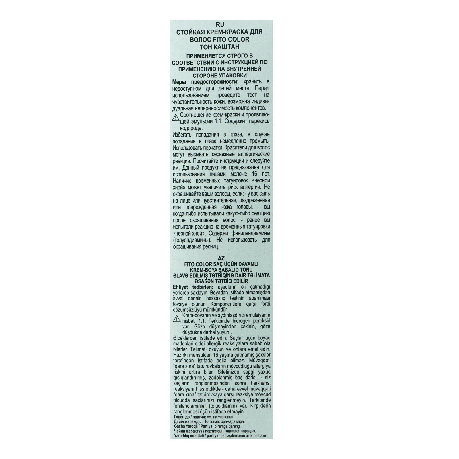 Состав: Крем-краска: Aqua, Cetearyl Alcohol, Ceteareth-23, Ricinus Communis Seed Oil (касторовое масло), Chamomilla Recutita Oil (масло ромашки), Soluble Collagen (коллаген), Glycerin, Ethanolamine, Xanthan gum, Triethanolamine, Parfum,Toluene-2,5-diamine, p-Aminophenol, 4-Amino-2-Hydroxytoluene. Проявляющая эмульсия 9%: Aqua, Hydrogen Peroxide, Acrylates Copolymer, Triethanolamine, Tetrasodium EDTA. Бальзам–кондиционер после окрашивания волос: Aqua, Linseed Oil (масло льна), Hamamelis Virginiana Leaf Extract (экстракт гамамелиса), Simmondsia Chinensis Seed Oil (масло жожоба), Ribes Nigrum Seed Oil (масло семян черной смородины), Panax Ginseng Root Extract (экстракт женьшеня), Glycerin, Behenamidopropyl Dimethylamine, Glyceryl Stearate, Glyceryl Stearate SE, Hydrolyzed Keratin (гидролизованый кератин), Parfum, Lactic Acid, Benzoic Acid, Sorbic Acid, Dehydroacetic Acid, Benzyl alcohol. | ||