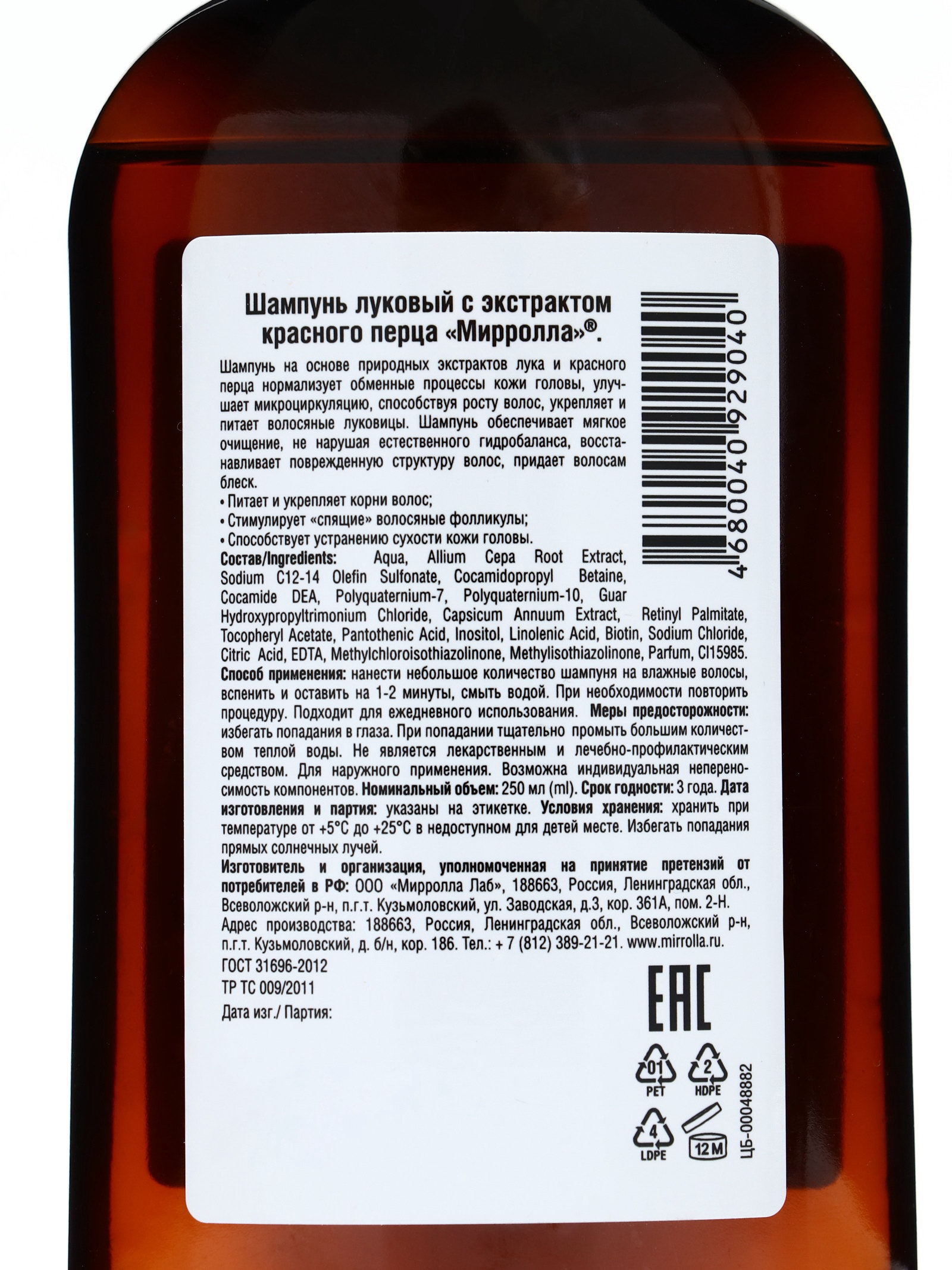 Шампунь луковый с экстрактом красного перца, 250 мл, 3.8x7.2x15.9 см., Mirrolla, Россия
