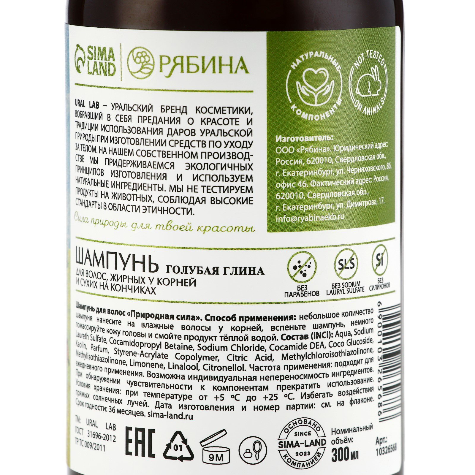Шампунь для волос жирных у корней и сухих на кончиках с голубой глиной, питание и объём, 300 мл, ECO LAB by, 300 мл., URAL LAB, Россия
