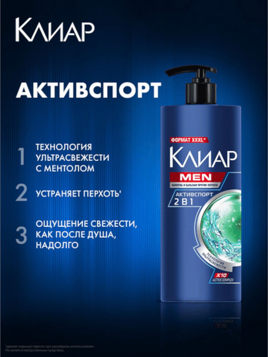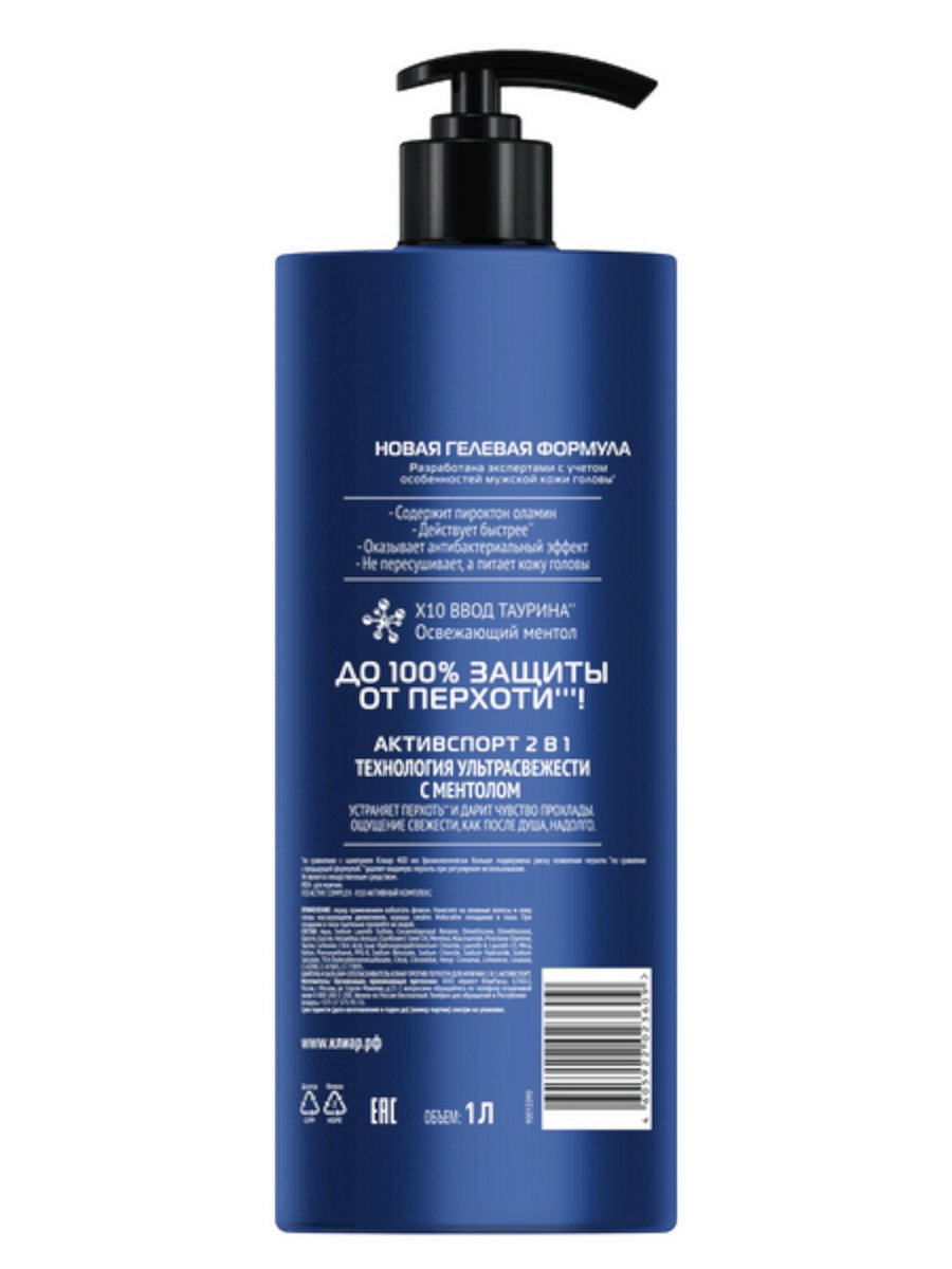 Шампунь-бальзам мужской "Клиар", против перхоти, активспорт, 1000 мл, 1000 мл., Clear, Россия