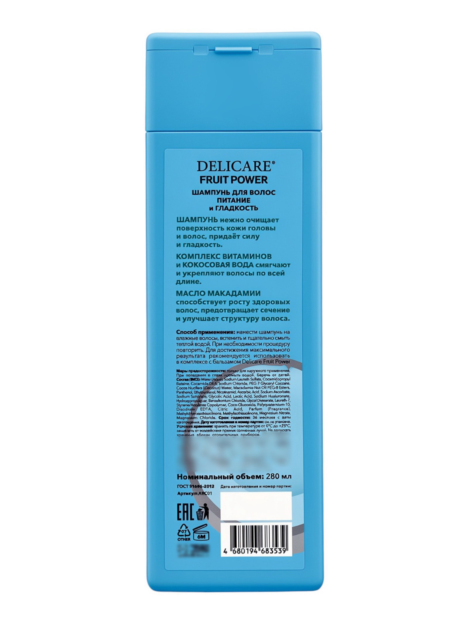 Шампунь для волос Fruit Power, питание и гладкость, с кокосом, 280 мл, Delicare, Россия