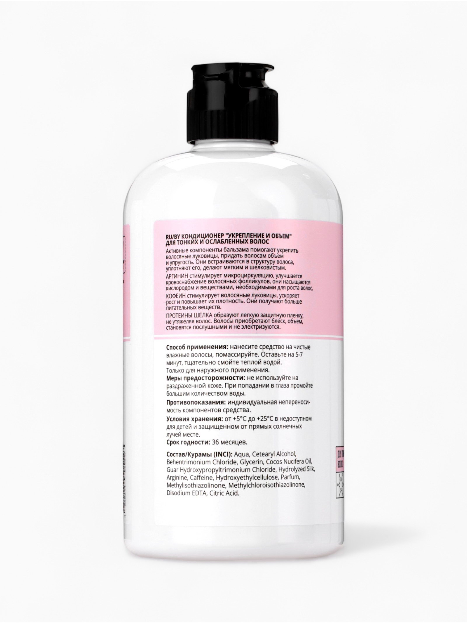 Состав (INCI): Aqua, Cetearyl Alcohol, Behentrimonium Chloride, Glycerin, Cocos Nucifera Oil, Guar Hydroxypropyltrimonium Chloride, Hydrolyzed Silk, Arginine, Caffeine, Hydroxyethylcellulose, Parfum, Methylisothiazolinone, Methylchloroisothiazolinone, Disodium EDTA, Citric Acid. Способ применения: Нанесите на чистые влажные волосы, помассируйте. Оставьте на 5–7 минут, затем тщательно смойте тёплой водой. Меры предосторожности: Не использовать на раздражённой или повреждённой коже. При попадании в глаза промыть большим количеством воды. Возможна индивидуальная непереносимость компонентов. Только для наружного применения. | ||