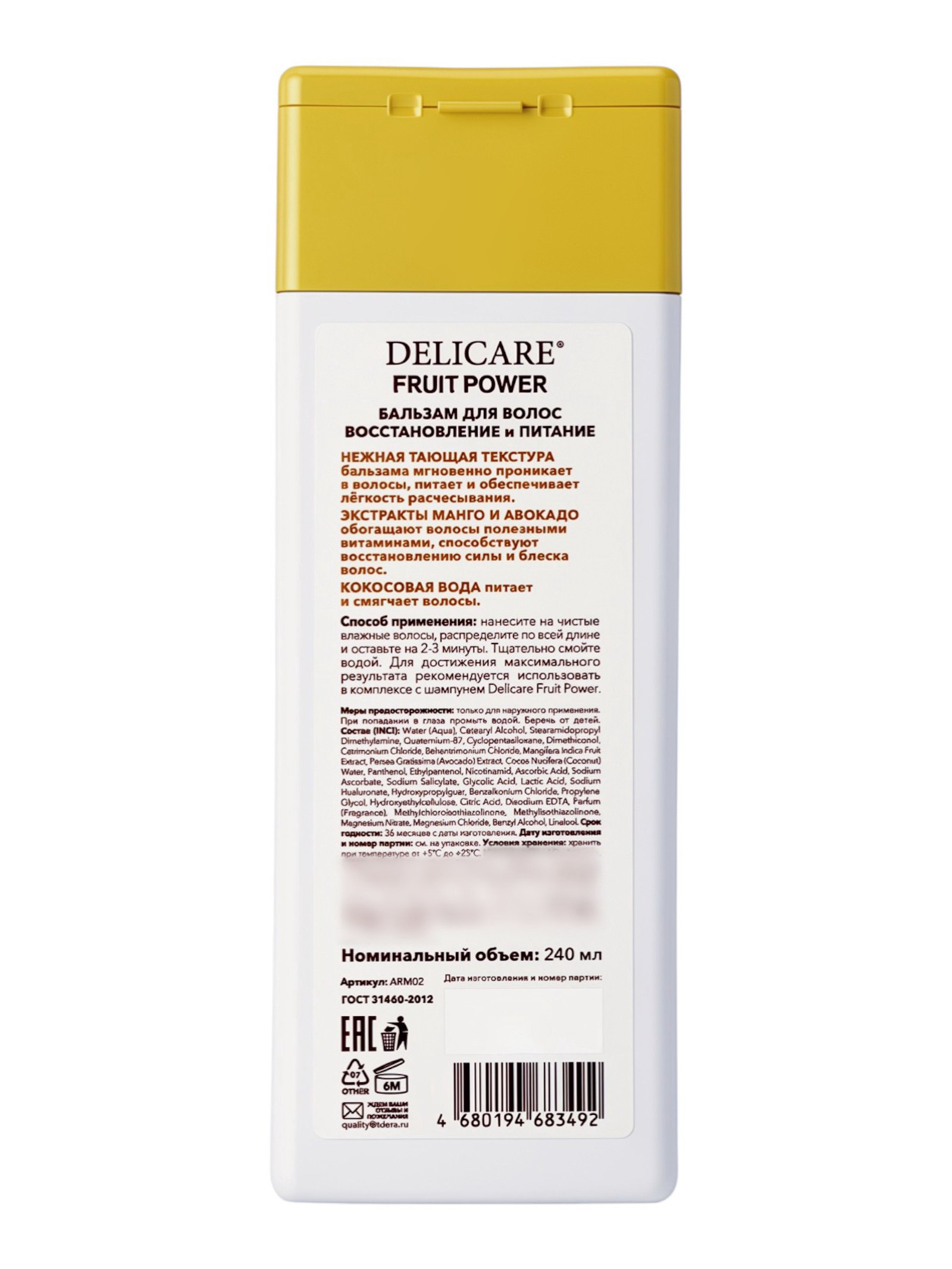 Бальзам?маска для волос Fruit Power, восстановление и питание, с манго, 240 мл, Delicare, Россия