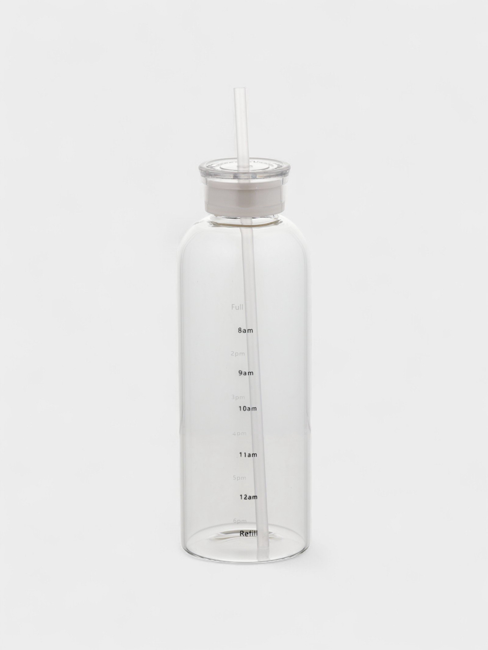 Бутылка для воды, 750 мл, 7.5x23 см, с трубочкой и шкалой времени, стекло, прозрачная, 7.5x7.5x23 см., Китай