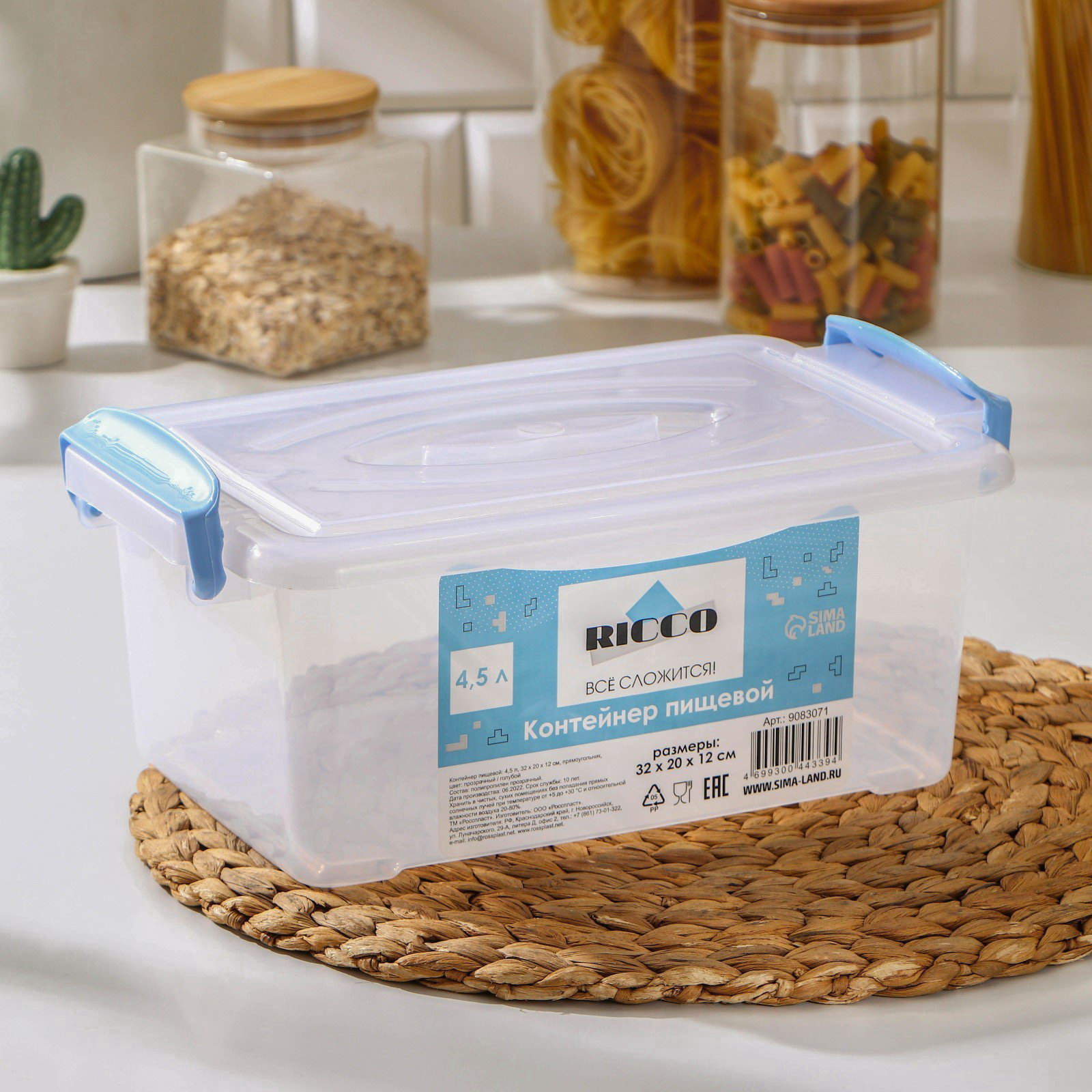 Контейнер пищевой, 4.5 л, с ручками, 30x19x13 см, пластик, прямоугольный, прозрачный, ручки МИКС, 19x30x13 см., RICCO, Россия
