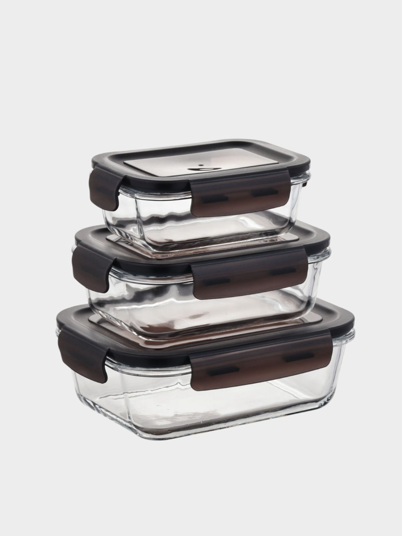 Набор контейнеров, 3 шт.: 410/690/1040 мл, стекло, прозрачный, черная крышка, 15.5x20.5x7 см., Китай
