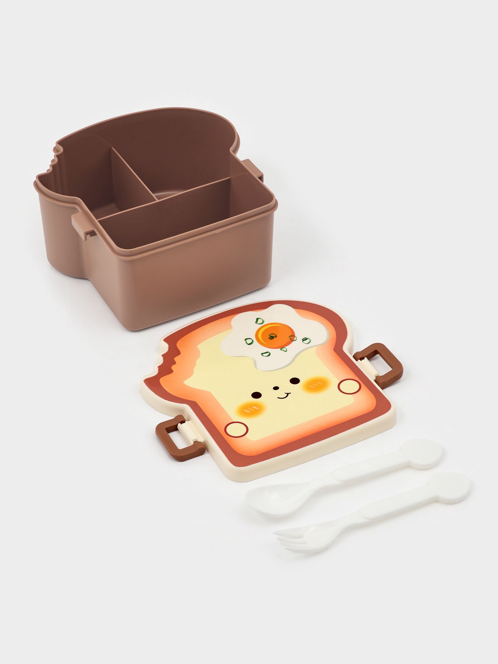 Ланч - бокс контейнер для еды "Завтрак", 3 ячейки, вилка, ложка, 16x15.5x8 см, пластик, коричневый, 15.5x16x8 см., Доляна, Китай