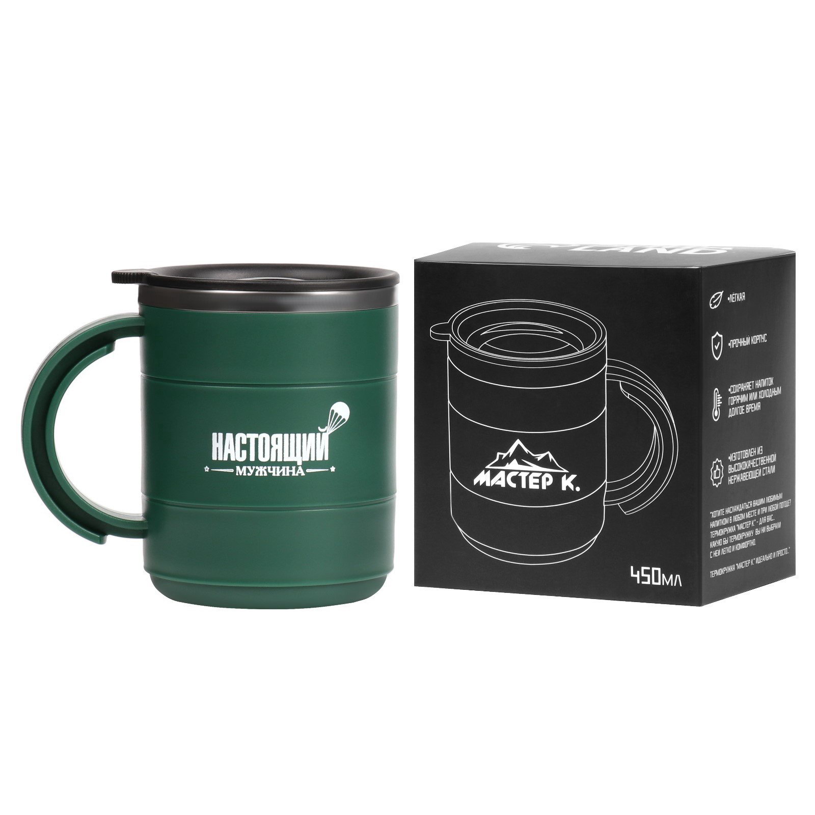 Размер упаковки: 9 x 12.5 x 12 см. Цвет: Зелёный Особенности: С адресатом Рисунок: Да Крышка: Да Материал колбы: Металл Слои: Многослойные Материал корпуса: Пластик Вакуумный: Нет Вид: Термокружки Можно мыть в посудомоечной машине: Нет С ручкой: Да Наличие дополнительной ёмкости: Нет tnved: 7323930000 tnved: 7323930000 Тематика праздника: Универсальная тематика Время сохранения тепла/холода, ч: 2 ПРИМЕЧАНИЕ: Данный товар может поставляться в цветной упаковке, которая может отличаться от фото на сайте. Эту обёртку Вы можете легко снять без усилий, сам товар упакован в чёрную коробку. Термокружка объёмом 450 мл, изготовленная из высококачественной нержавеющей стали - Ваш надёжный спутник для поддержания идеальной температуры напитков до 2 часов! Преимущества: