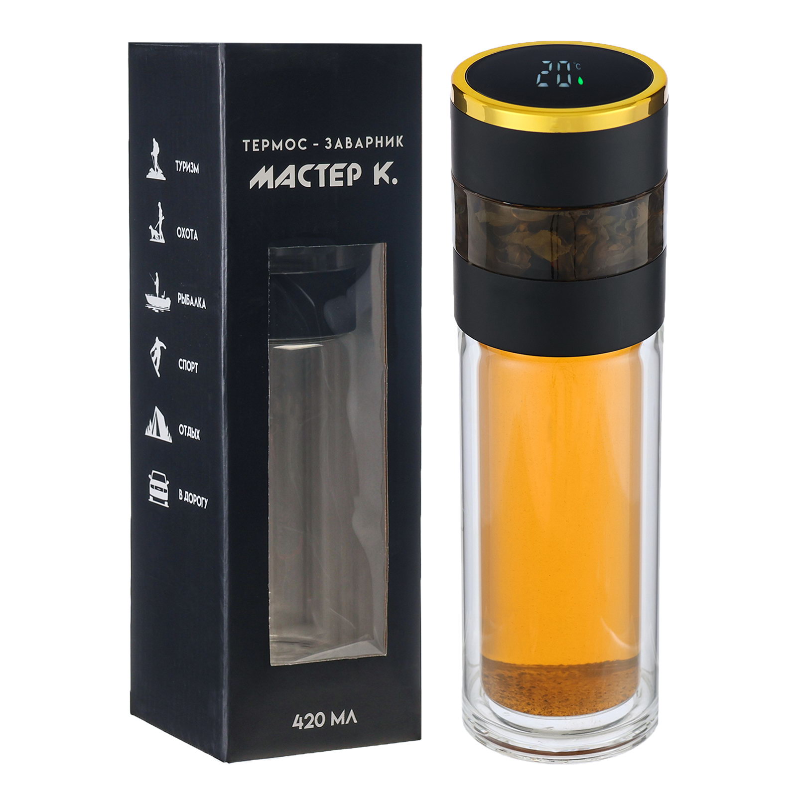 Термос заварник 420 мл, с термометром, сохраняет тепло до 12 ч, черный, 420 мл., Мастер К, Китай