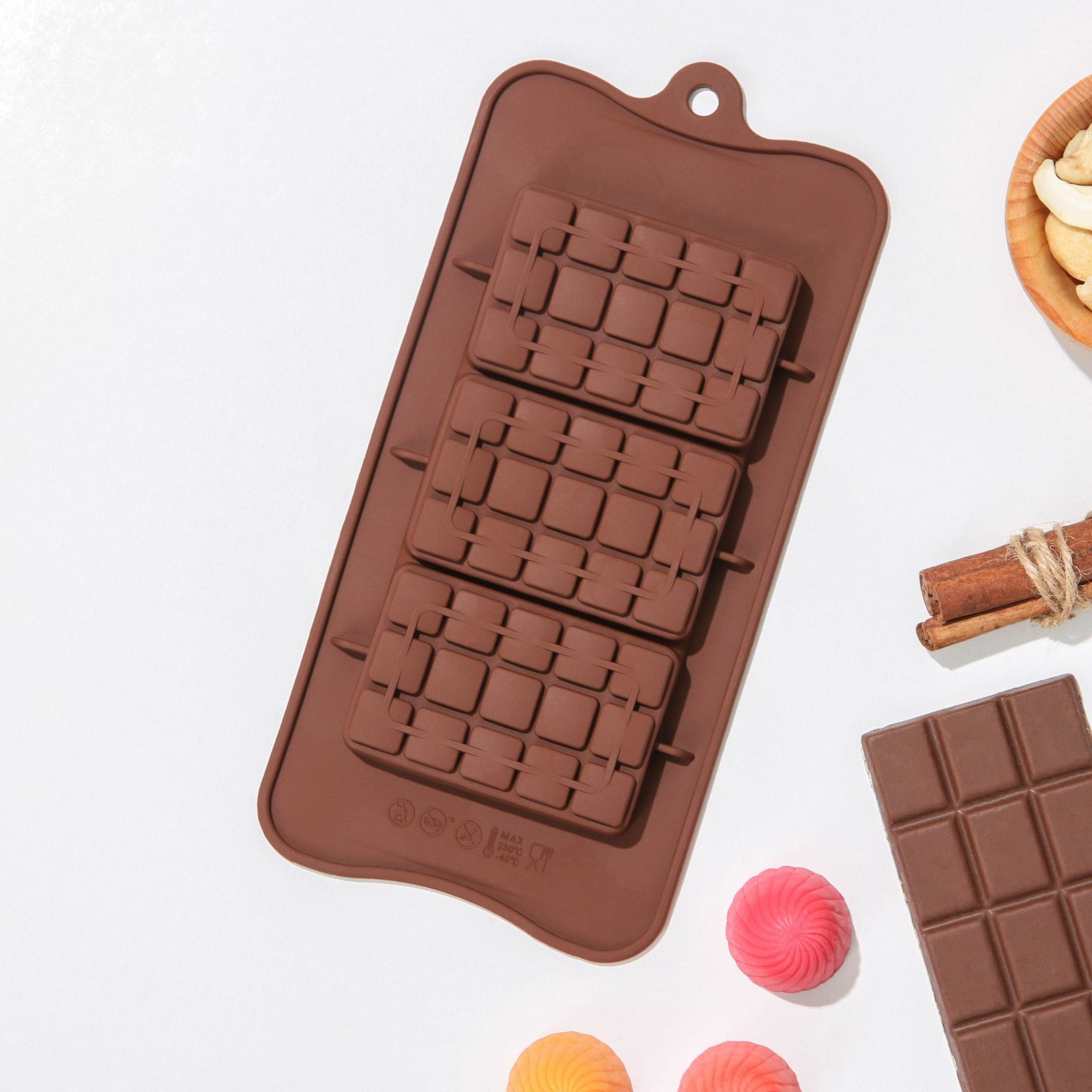 Форма: Мини-плитка, Прямоугольник Размер упаковки: 13 x 28 x 1 см. Разъёмная форма: Нет Ячейки: Да Наличие палочек для форм: Нет Рисунок: Нет Можно мыть в посудомоечной машине: Да Съёмное дно: Нет Тип формы: Для шоколада Тематика праздника: Универсальная тематика Фасовка, шт.: 1 Фасовка, шт.: 1 tnved: 3924100000 Цвет: Коричневый Количество ячеек: 3 Набор: Нет Тематика: Геометрические фигуры Тип покрытия: Без покрытия Силиконовые формы для шоколада помогут создавать неповторимые сладкие плитки и фигурки! Приготовление шоколада с использованием формы гораздо проще, чем кажется. Наполните силиконовую ёмкость расплавленным шоколадом и поместите в морозильную камеру. Вскоре у вас будут оригинальные десерты, которые сделают запоминающимся любой праздничный стол! Достоинства: