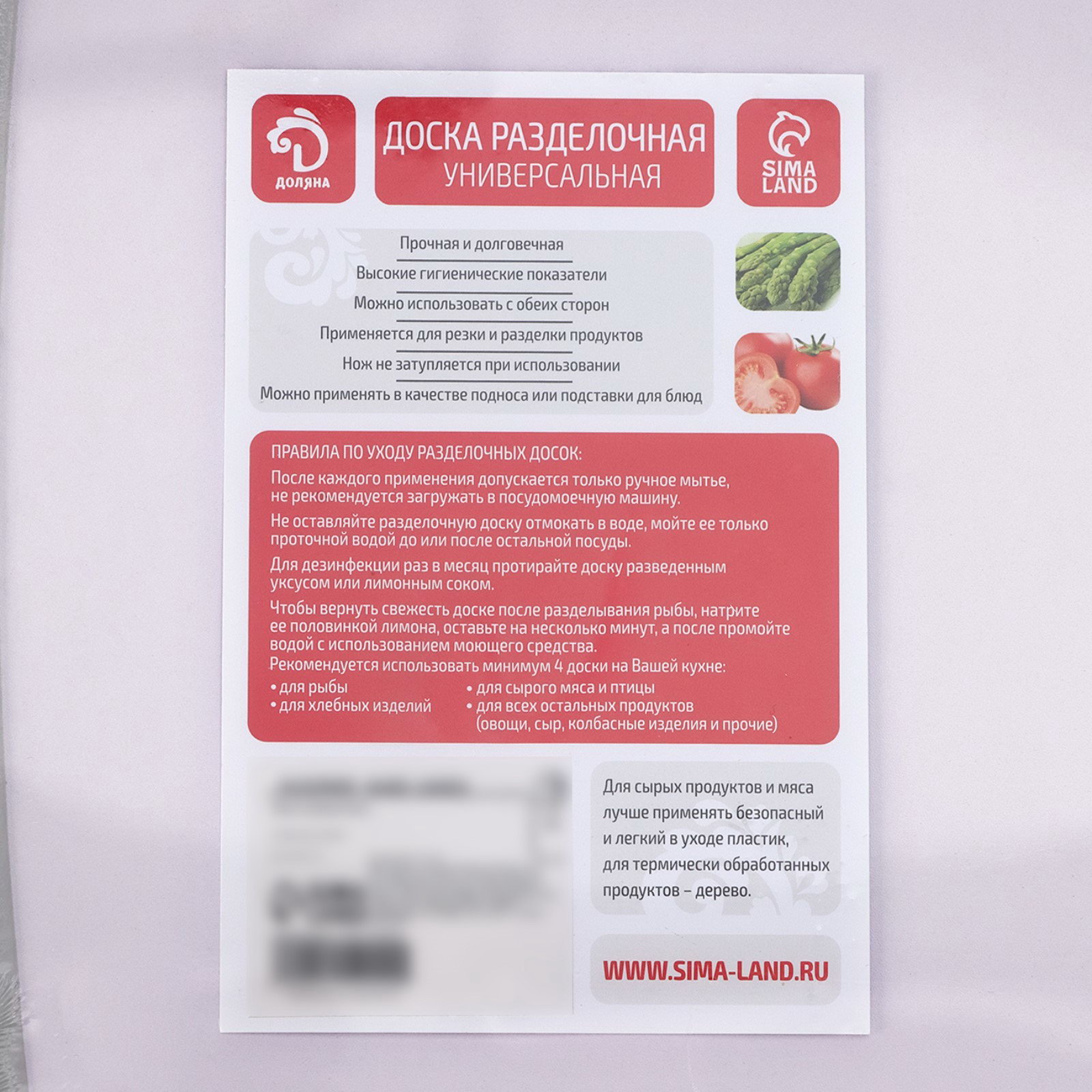 Размер упаковки: 19.8 x 1 x 29.8 см. Форма: Прямоугольник Цвет: Серый Толщина, см: 1 tnved: 3924100000 Длина, см: 30 Набор: Нет Рисунок: Да Ширина, см: 20 Тип нанесения рисунка: Ламинация Можно мыть в посудомоечной машине: Нет Особенности: Подвесная В приготовлении блюд разделочная доска играет не меньшую роль, чем сковорода, нож или плита. Качественная разделочная доска поможет получить от процесса приготовления пищи максимум пользы. Преимущества: