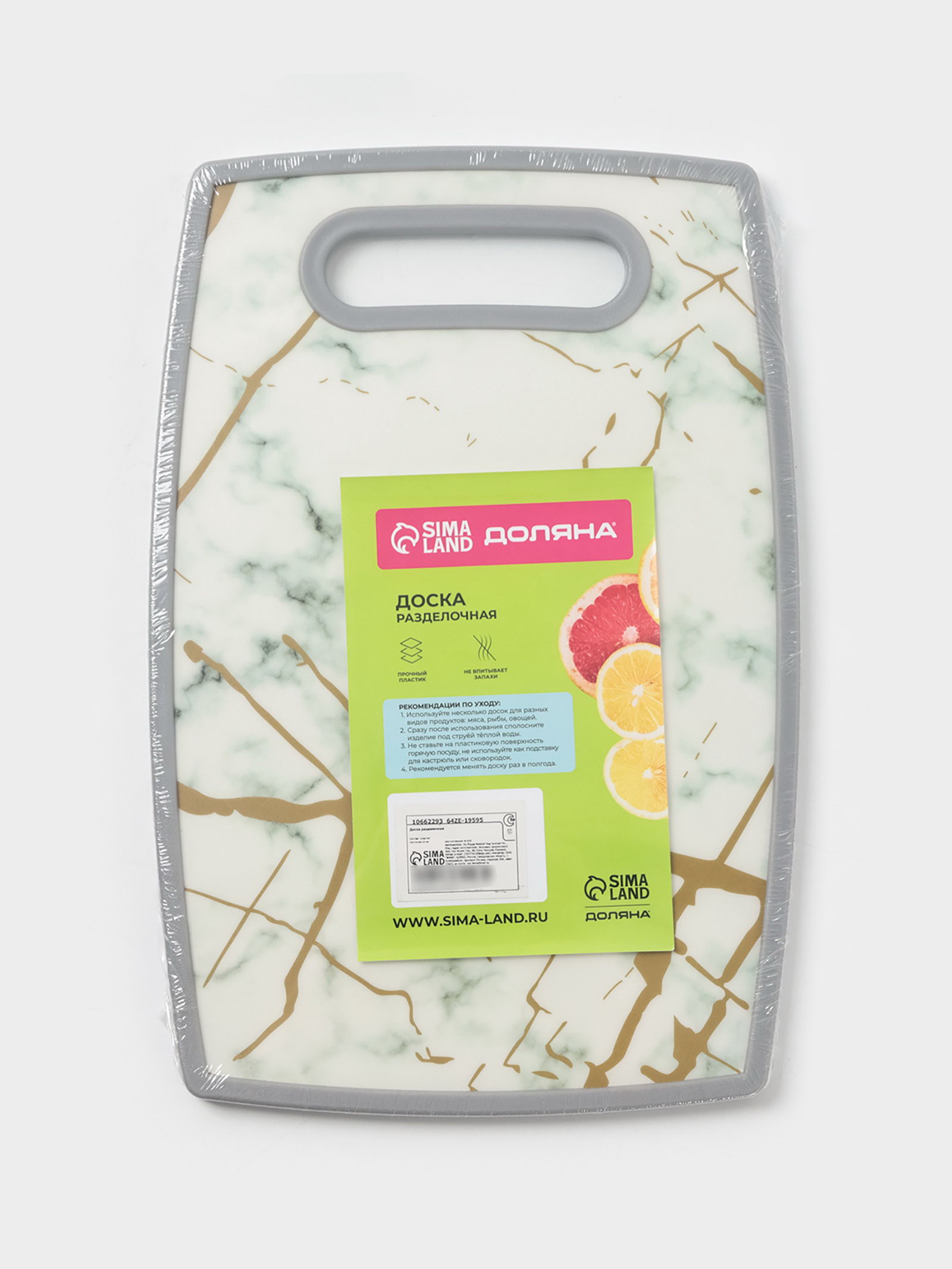 Размер упаковки: 19.7 x 1 x 30 см. Особенности: Без особенностей Тип нанесения рисунка: Ламинация Длина, см: 29.5 Рисунок: Да Ширина, см: 19.5 Набор: Нет Можно мыть в посудомоечной машине: Нет Цвет: Серый Форма: Прямоугольник Толщина, см: 1 tnved: 3924100000 В приготовлении блюд разделочная доска играет не меньшую роль, чем сковорода, нож или плита. Качественная разделочная доска поможет получить от процесса приготовления пищи максимум пользы. Преимущества: