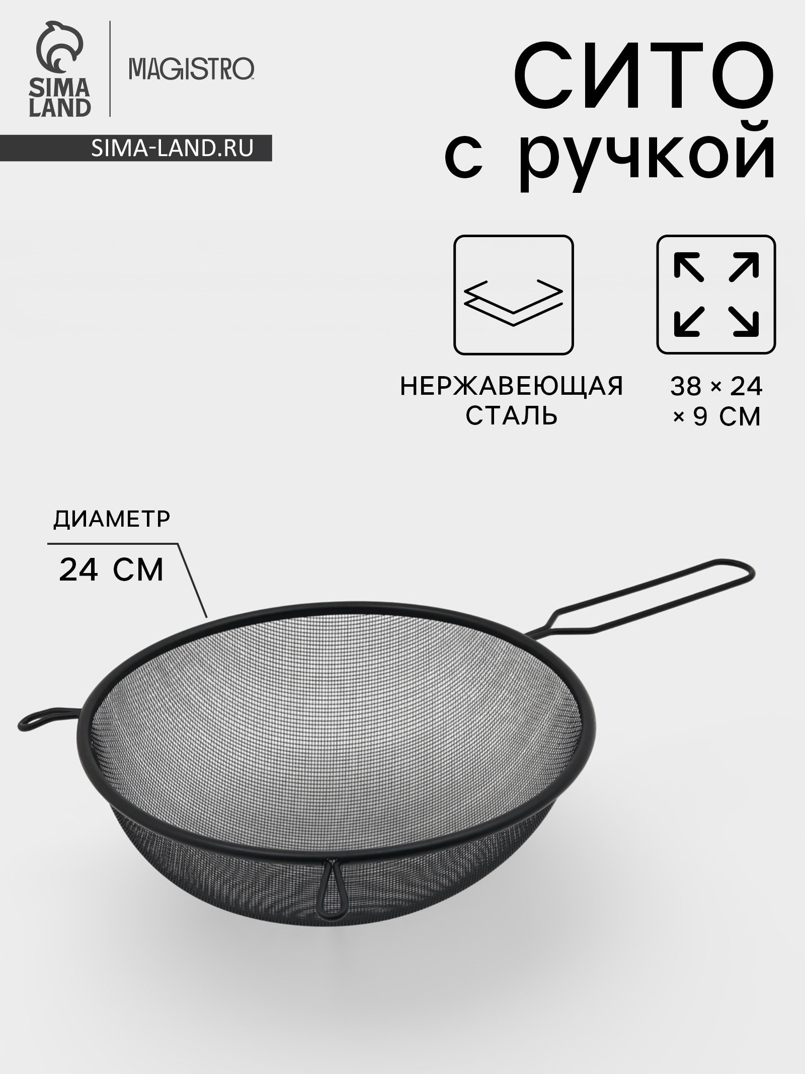 Сито для просеивания с ручкой "Нуар", d=24 см, нержавеющая сталь, чёрное, 24х24х9 см., Magistro, Китай