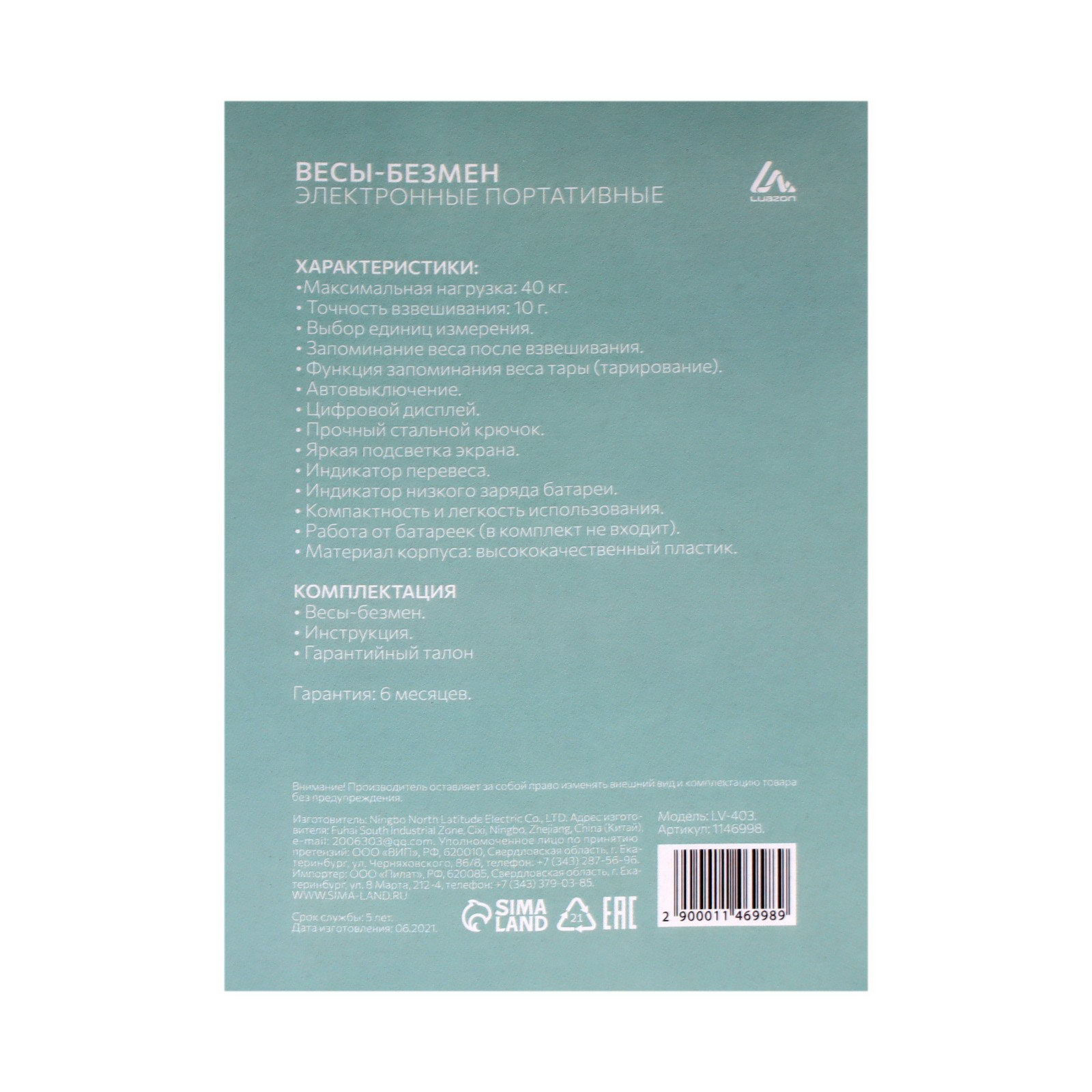 Весы-безмен Luazon LV-403, электронные, до 40 кг, точность до 10 г, подсветка, тёмно-синие, 5x8.5x2 см., Luazon Home, Китай