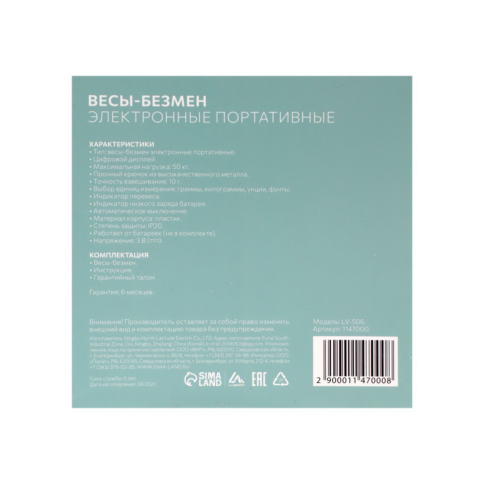 Весы-безмен Luazon LV-506, электронные, до 50 кг, точность до 10 г, подсветка, чёрные, 10x2x8 см., Luazon Home, Китай