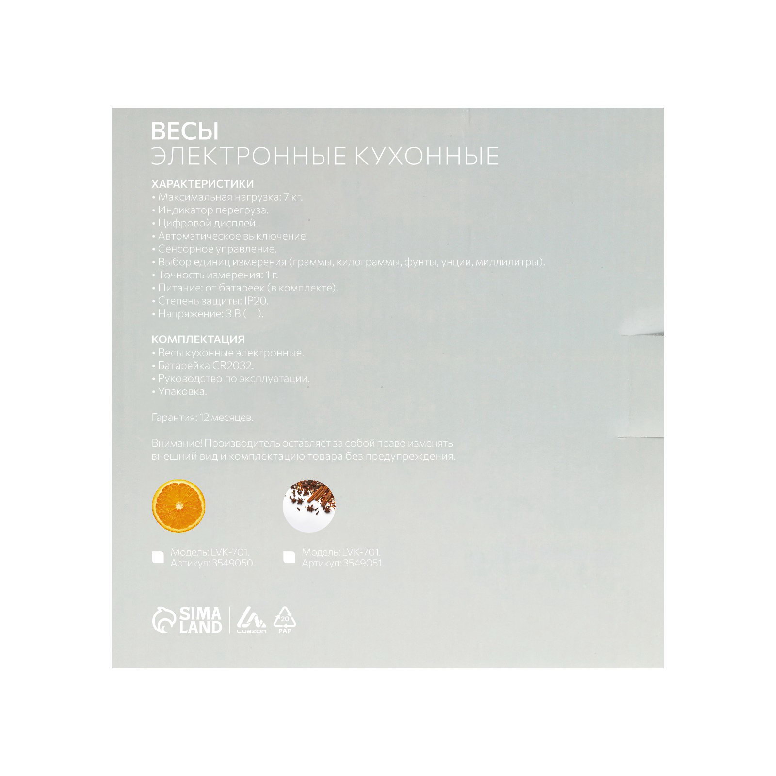 Весы кухонные Luazon LVK-701 "Апельсин", электронные, до 7 кг, 19x19x2 см., Luazon Home, Китай