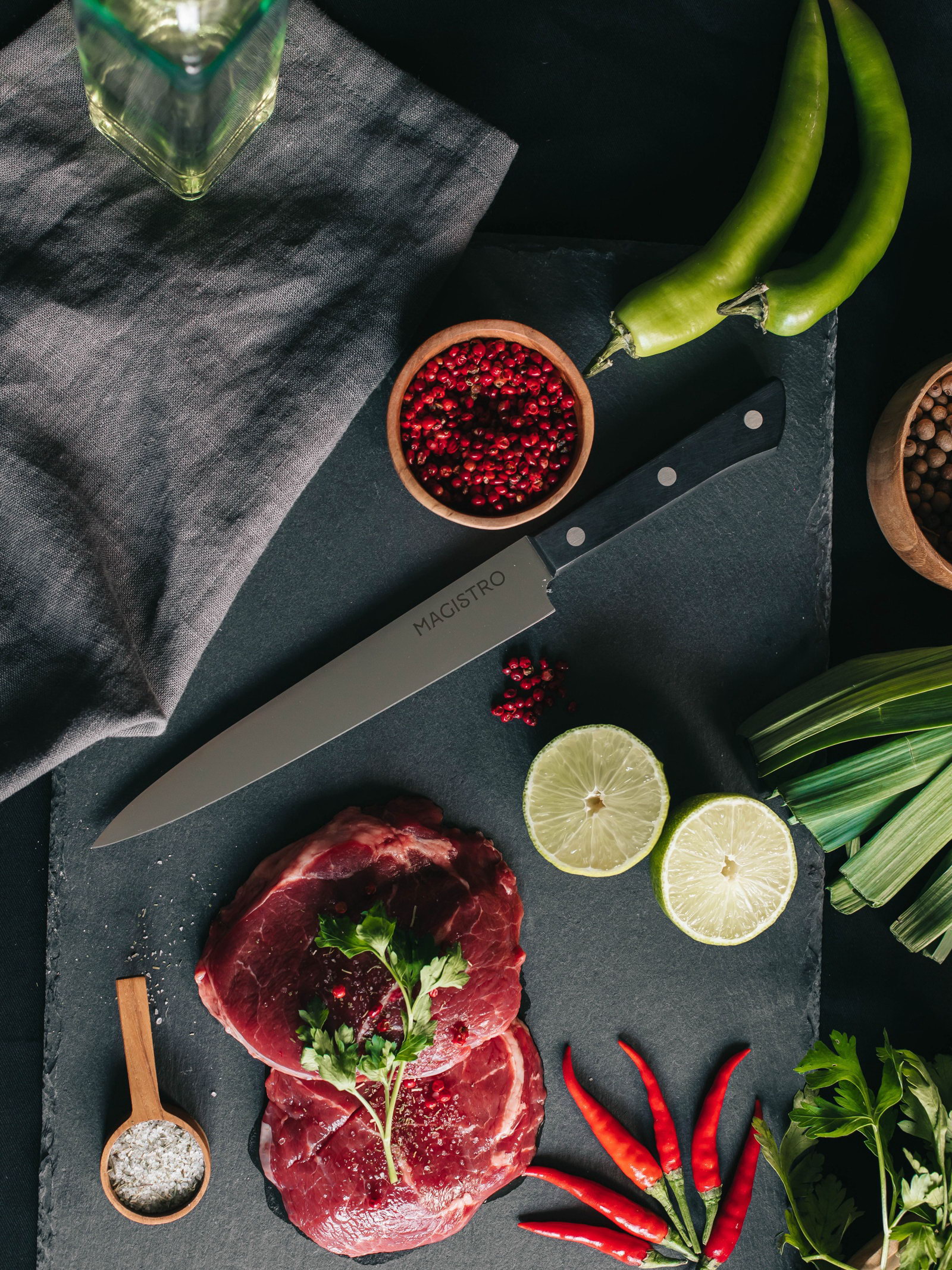 Нож кухонный разделочный Hinshitsu, нержавеющая сталь, лезвие 20.3 см, длина 34.7 см, чёрный, 7x34.7x2 см., Magistro, Китай
