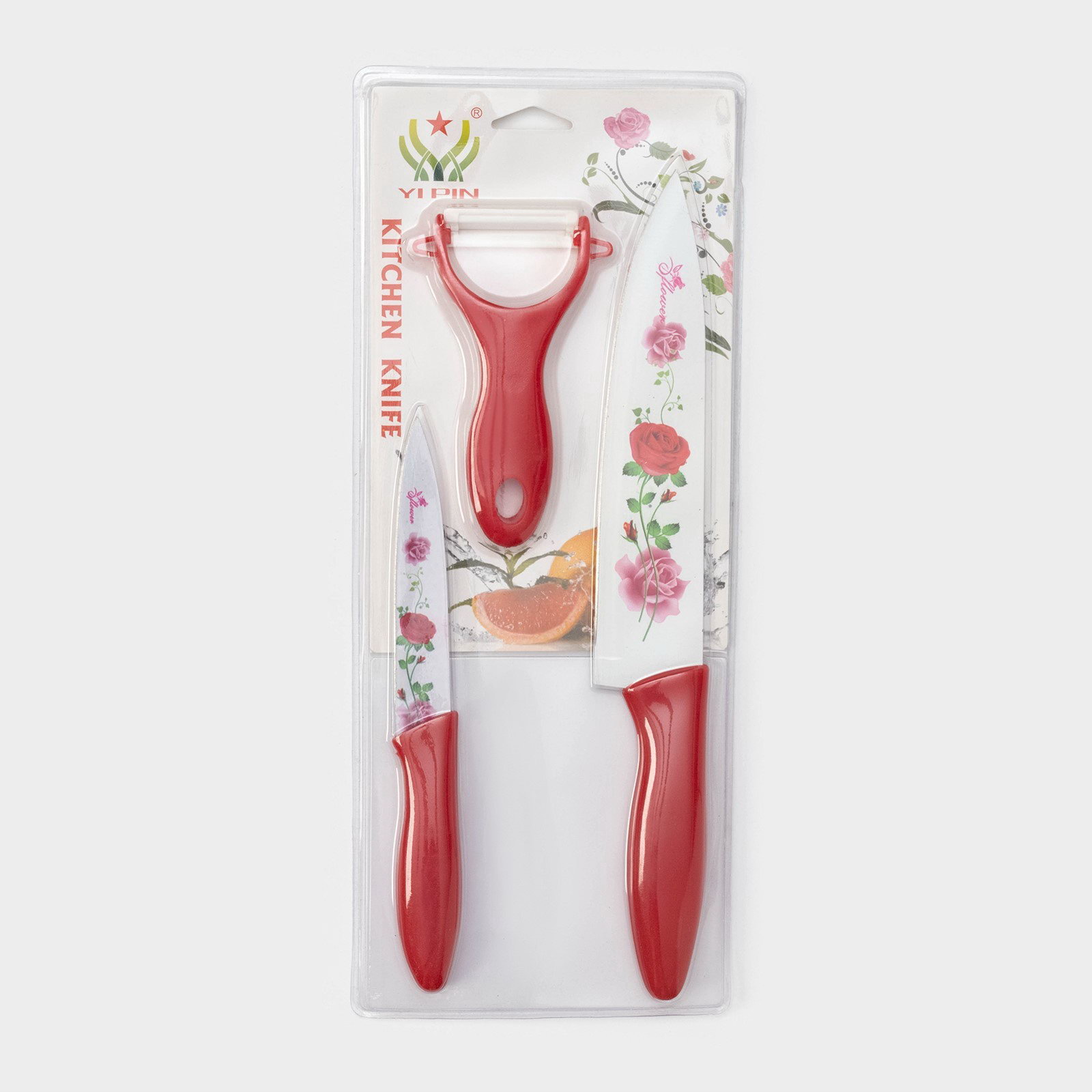 Набор кухонных принадлежностей "Нарцисс", 3 предмета: 2 ножа с антиналипающим покрытием, лезвие 12 см, овощечистка, 20x4 см, красный, 15x37x1.5 см., Доляна, Китай