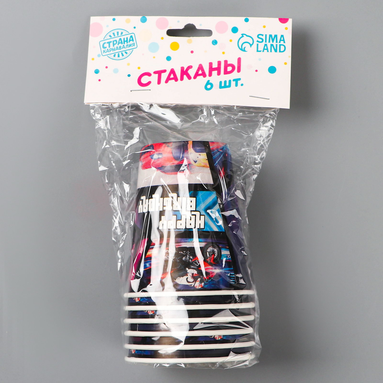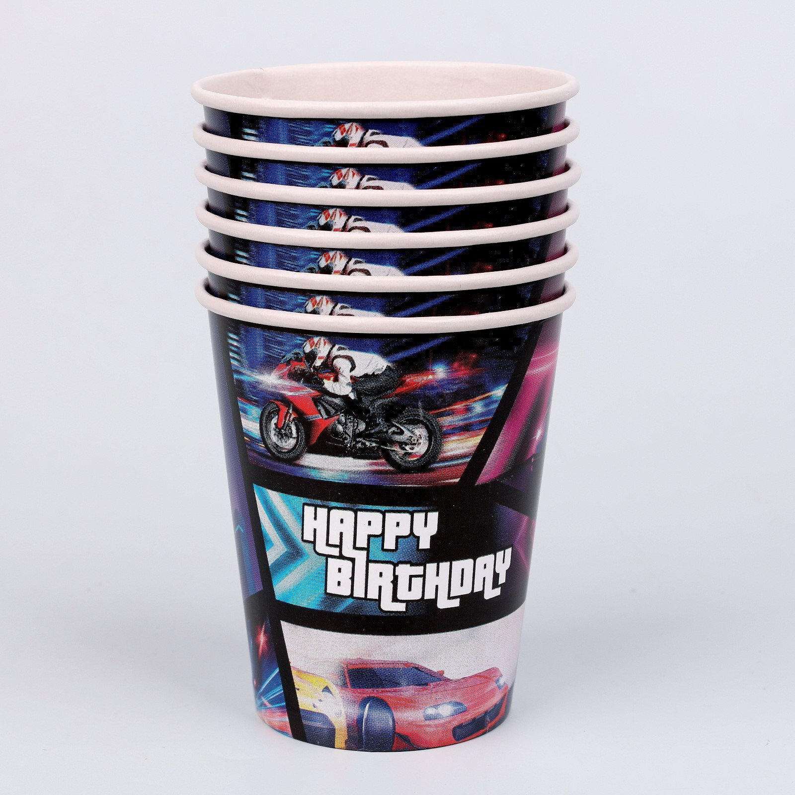 Стакан одноразовый бумажный Happy Birthday гонщик, набор 6 шт, 250 мл, 8 см., Страна Карнавалия, Россия