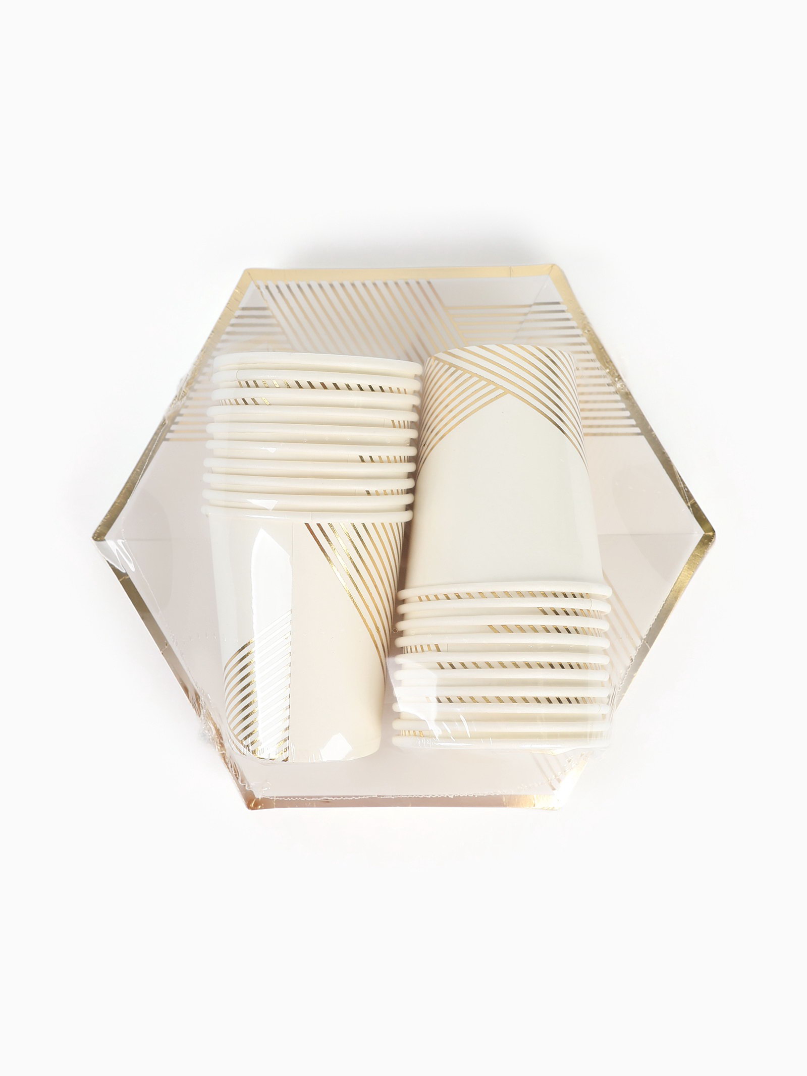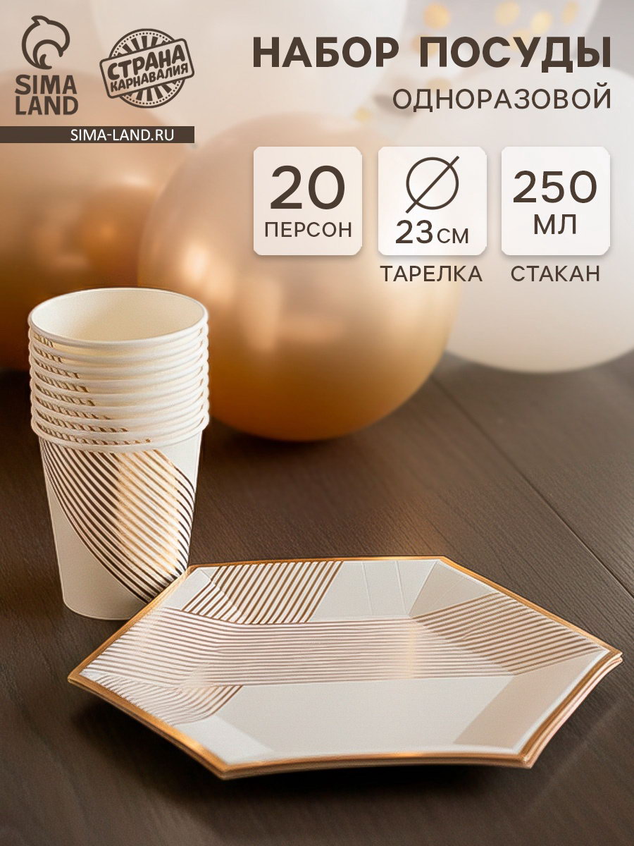 Посуда одноразовая бумажная на 20 персон, 40 предметов, бело-золотой цвет, Страна Карнавалия, Китай