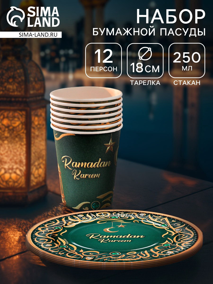 МП Набор бумжаной посуды "Ramadan Kareem", зелёный, 12 персон, Россия