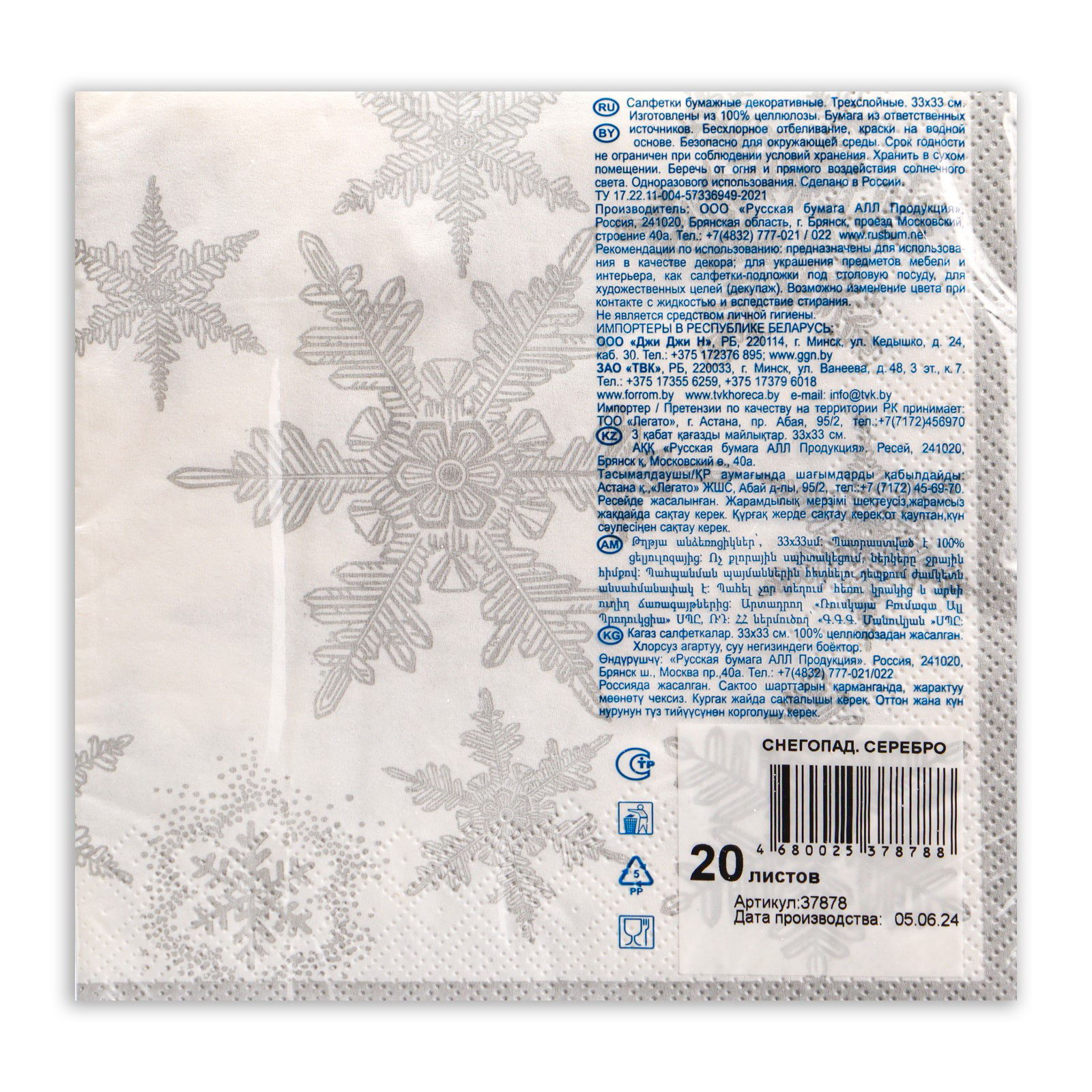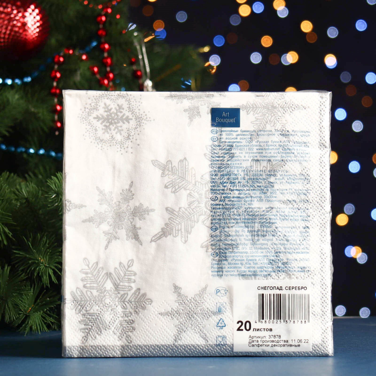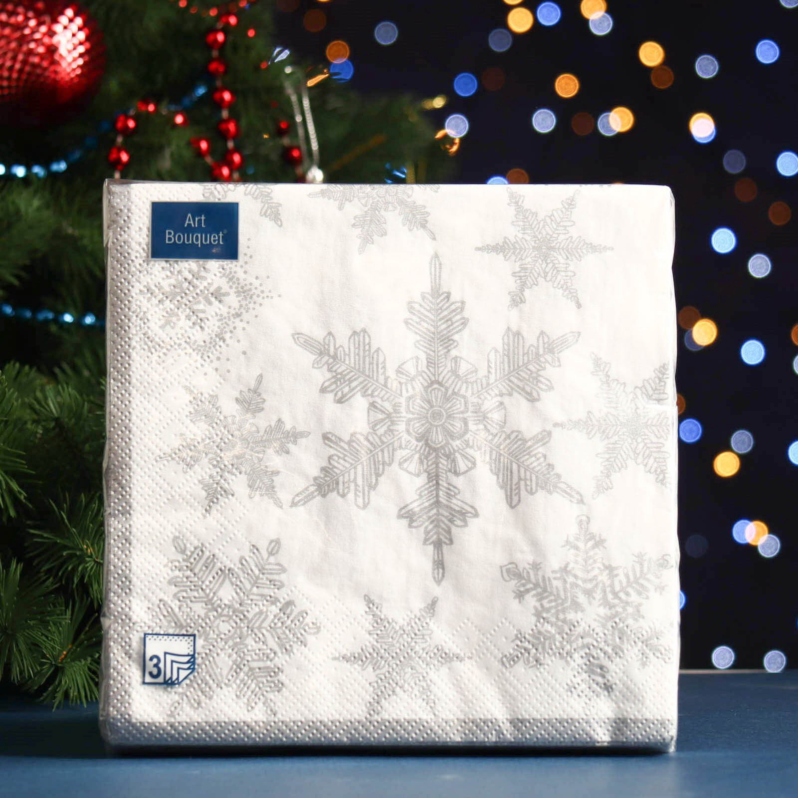 Салфетки новогодние бумажные Art Bouquet "Снегопад. серебро", 3 слоя, 33x33 см, 20 шт., АртБукет, Россия