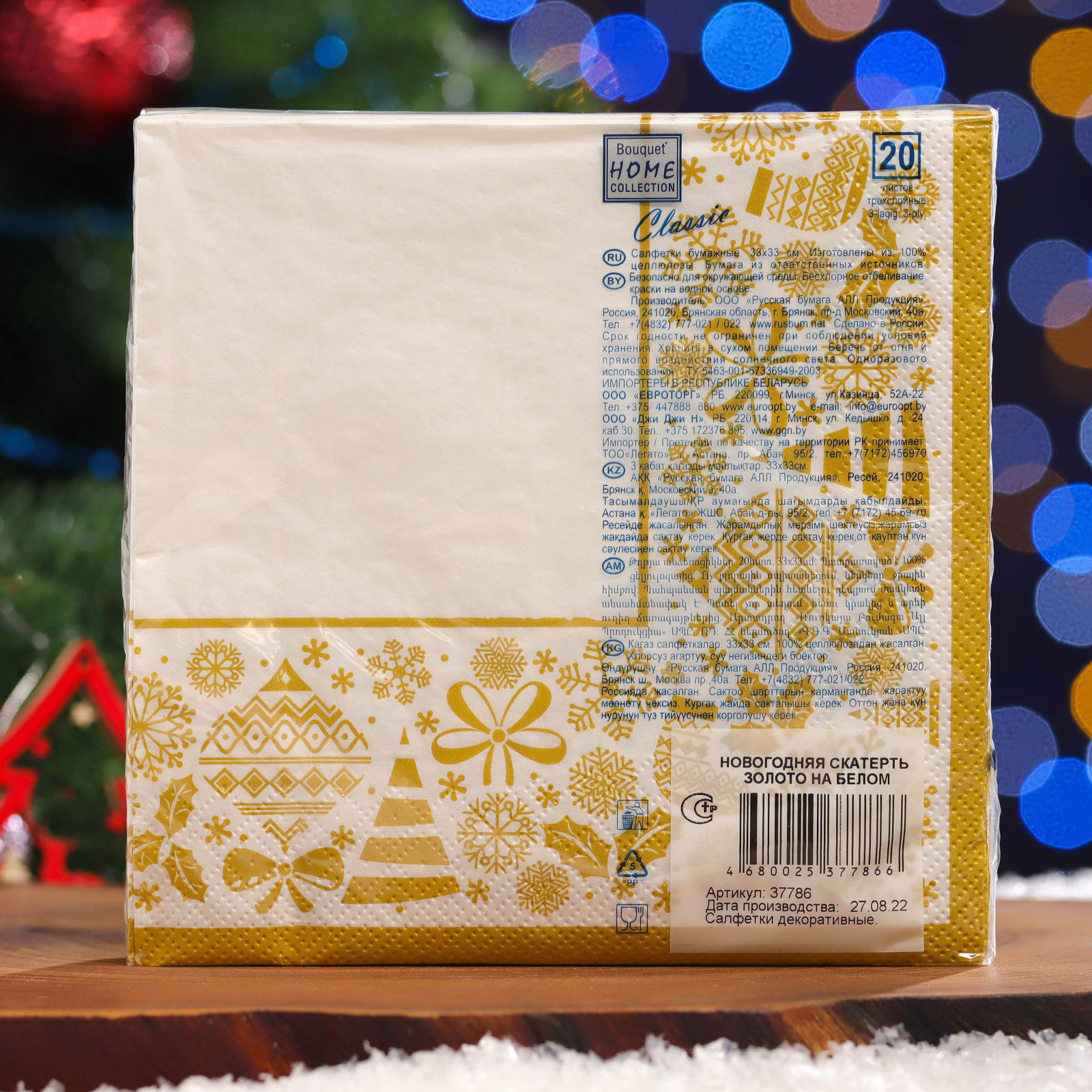 Салфетки бумажные Classic "Новогодняя скатерть, золото на белом", 3 слоя, 33x33 см, 20 шт., HOME, Россия