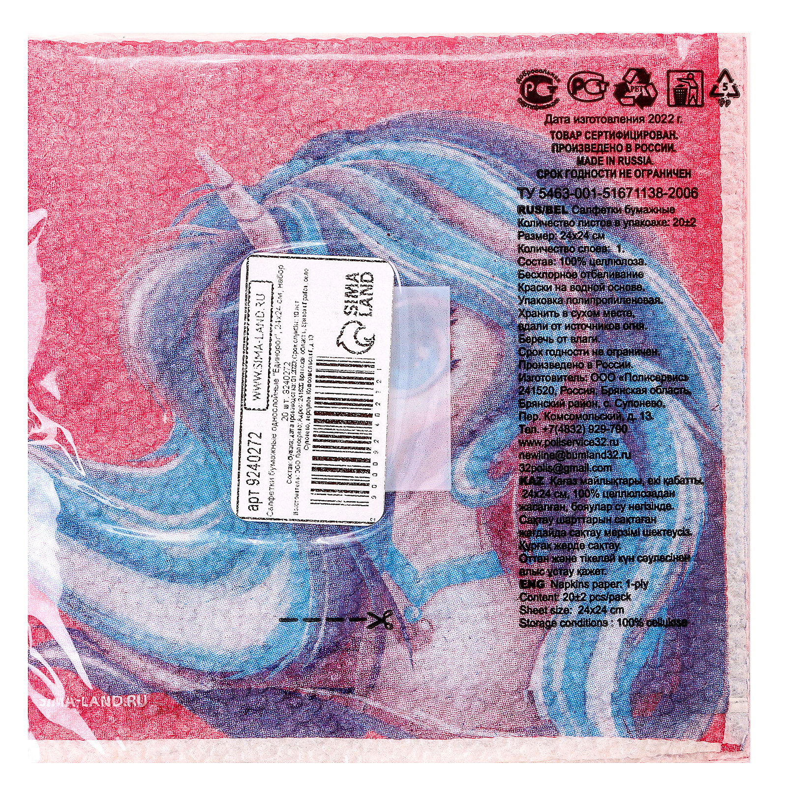 Салфетки бумажные однослойные "Единорог", 24 x 24 см, в наборе 20 шт., Страна Карнавалия, Россия