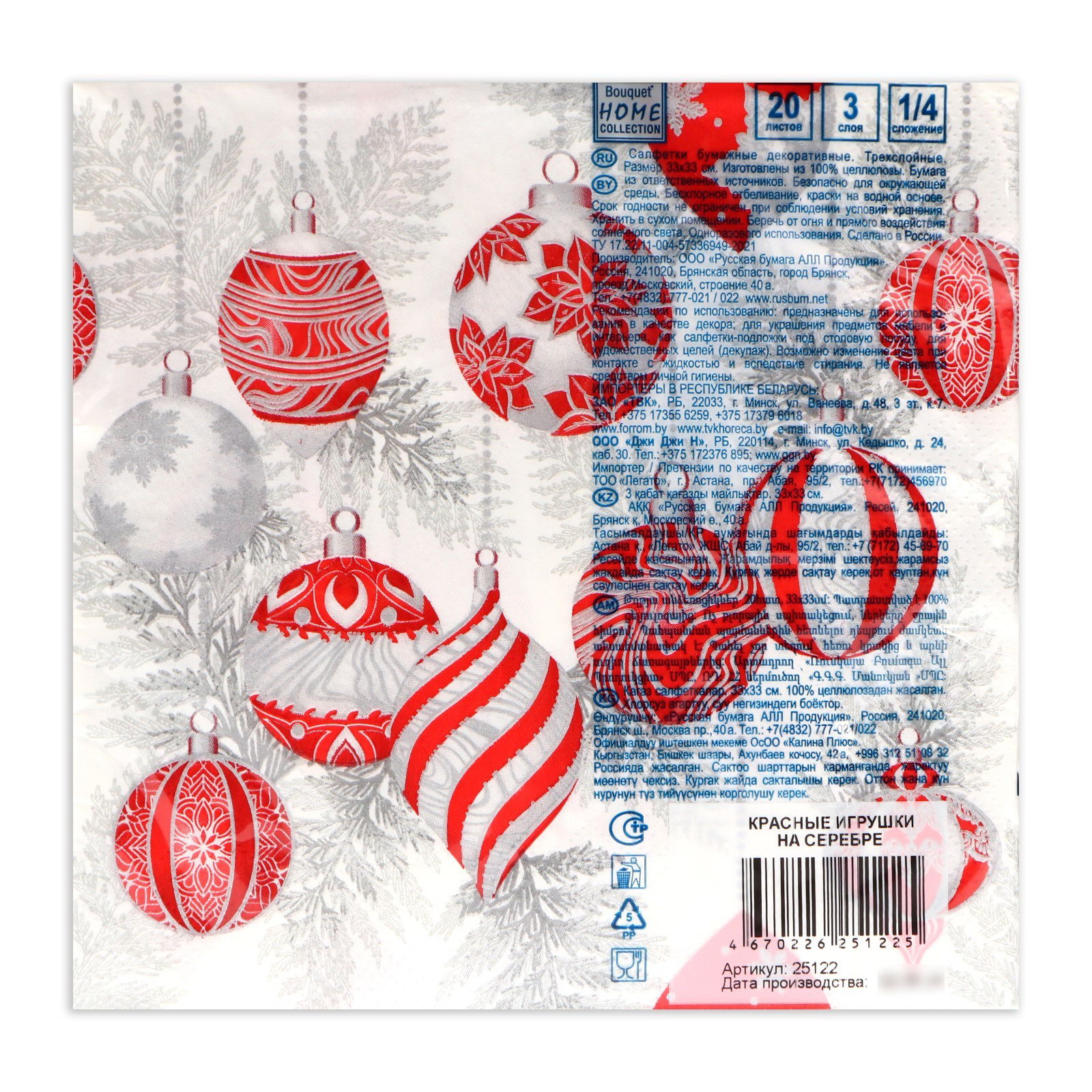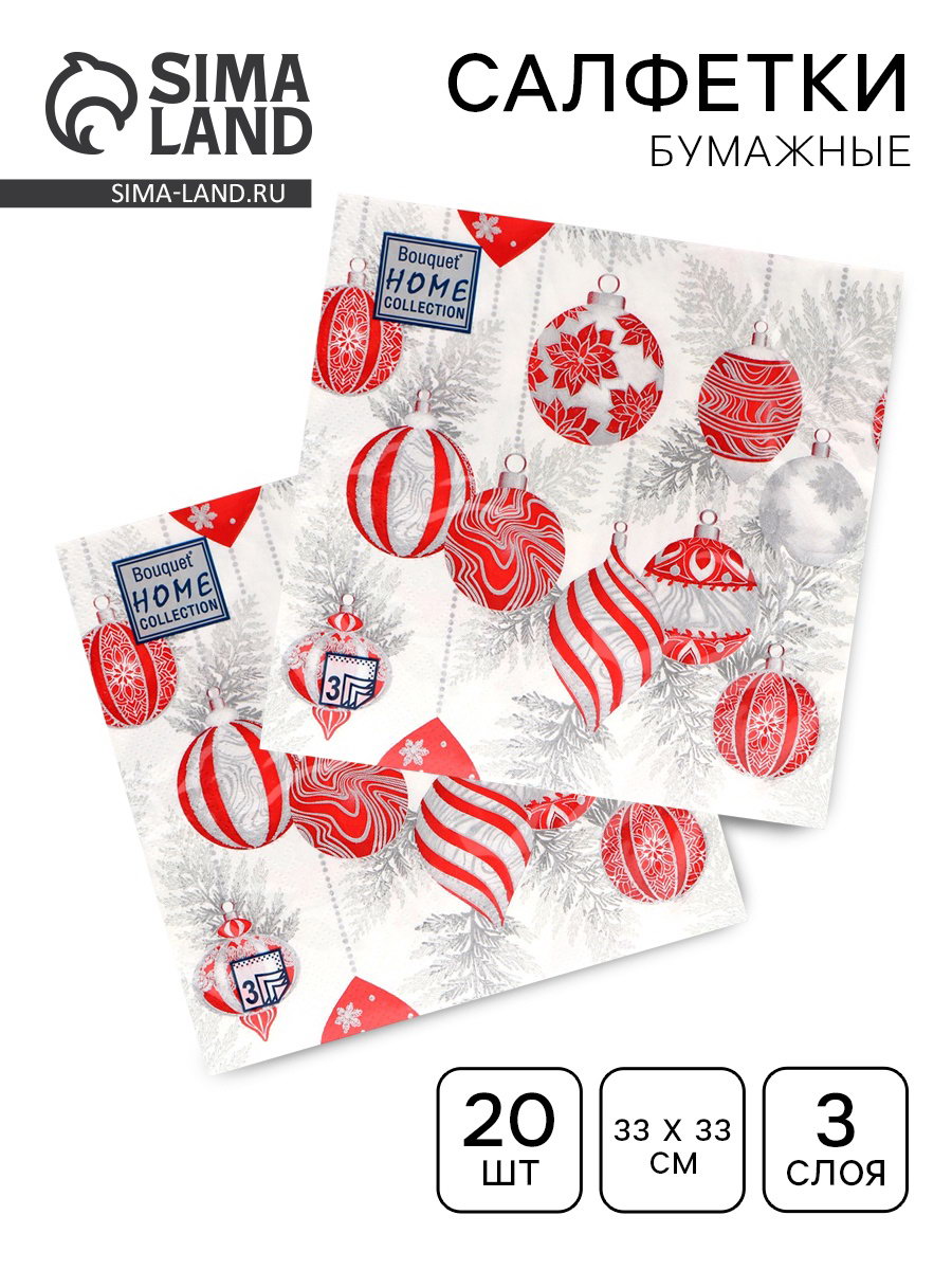 Салфетки новогодние бумажные Collection "Красные игрушки на серебре", 3 слоя, 33x33 см, 20 шт., HOME, Россия