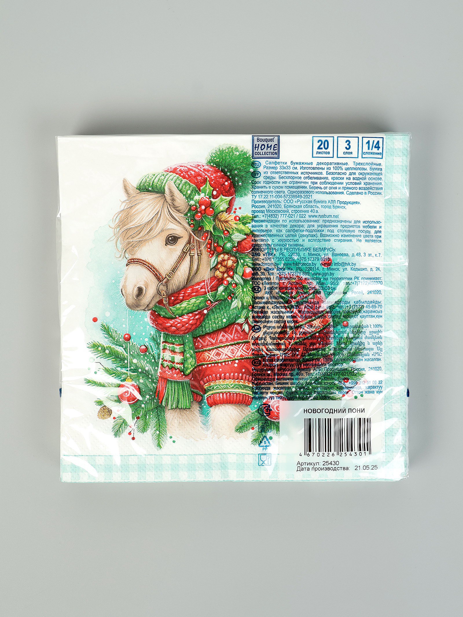 Размер упаковки: 16.5 x 2 x 16.5 см. tnved: 4818300000 Тематика праздника: Новый год Символ года: Символ года 2026 (Лошадь) Размер, см: 33 x 33 Цвет: Разноцветный Фасовка, шт.: 20 Тематика: Новогодняя Вид: С рисунком Тип бумаги: Трёхслойная В наборе, шт.: 20 Рисунок: Да | ||
