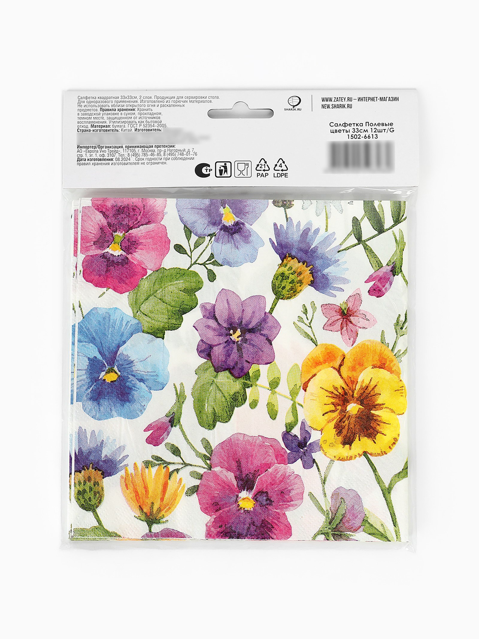 Салфетки бумажные двухслойные "Полевые цветы", 33 x 33, 12 шт, Страна Карнавалия, Китай