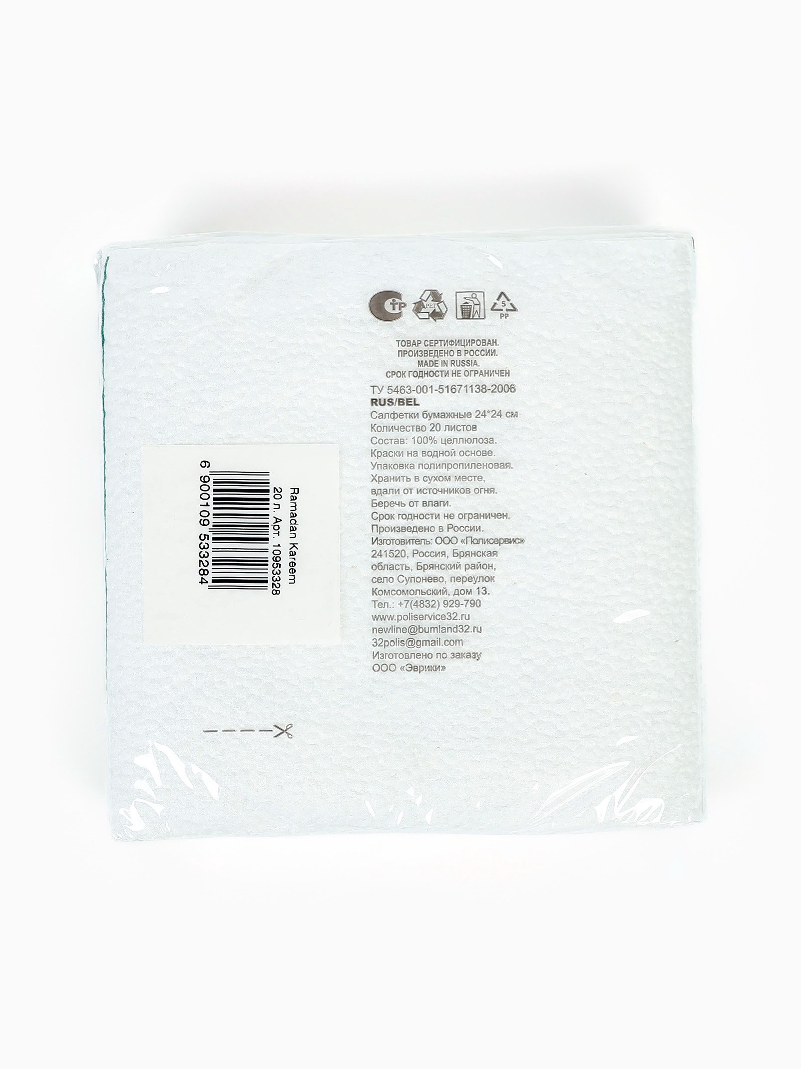 Салфетки бумажные однослойные "Ramadan Kareem", зелёные с золотом, 24x24 см, 20 шт., Страна Карнавалия, Россия